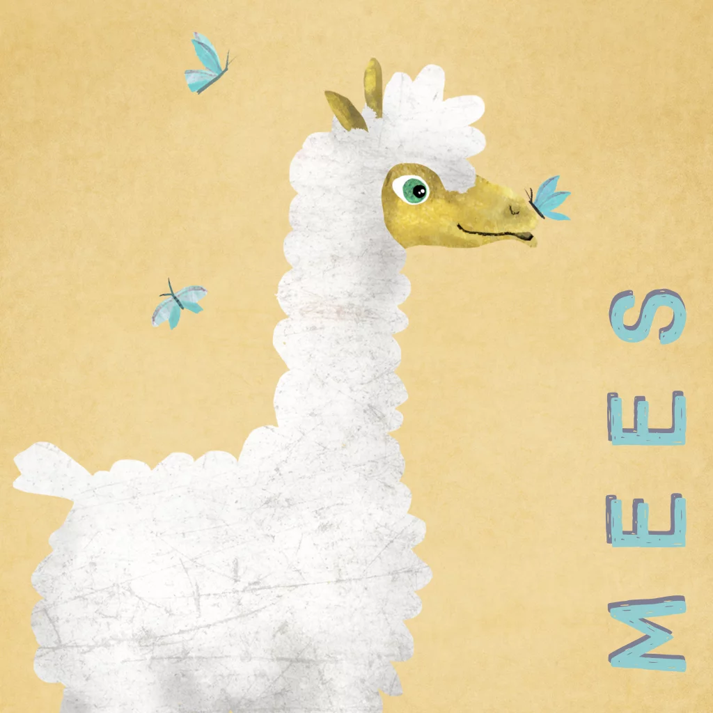 Geboortekaartje Mees met guitige lama met blauwe vlindertjes op een mooie okergele achtergrond. Je past dit kaartje eenvoudig zelf aan.
