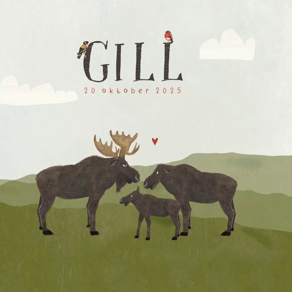 Stoer geboortekaartje Gill met een coulisselandschap en een vader, moeder en baby eland in mooie donkergroene kleuren en een vintage achtergrond.