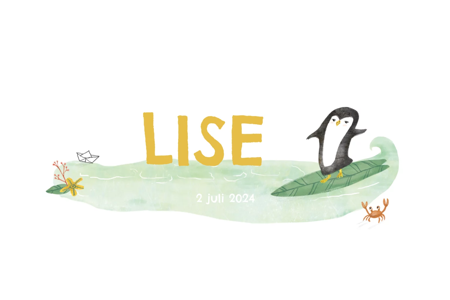 Tropisch babykaartje Lise met een pinguïn op een surfplank, een krabbetje en een papieren bootje op de golven. Lekker zomers kaartje voor een zonnige baby! Je kunt de kaart eenvoudig zelf aanpassen..