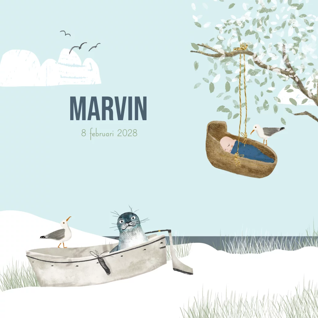 Winters getekend geboortekaartje Marvin, met een hangmandje met baby een roeiboot en een zeehond. Nieuwsgierige meeuwen kijken toe. Wat een schattig winter geboortekaartje voor jouw zoon!