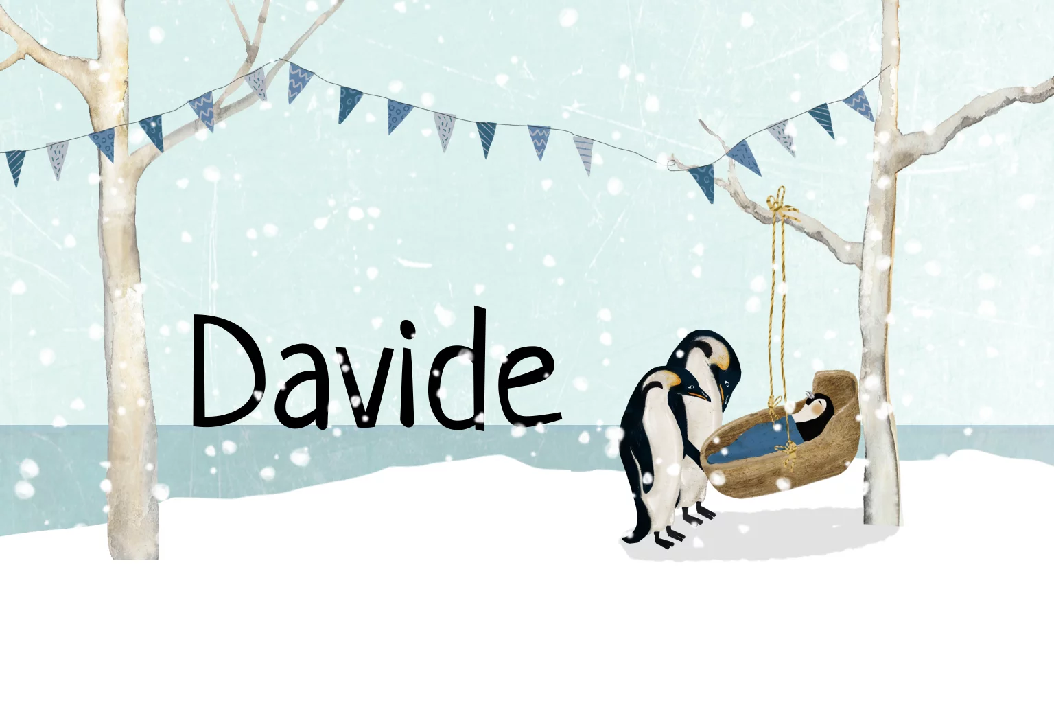 Winter geboortekaartje Davide, met een hangend wiegje en pinguins die toekijken. Een mooi geboortekaartje voor je zoon die in de winter wordt geboren!