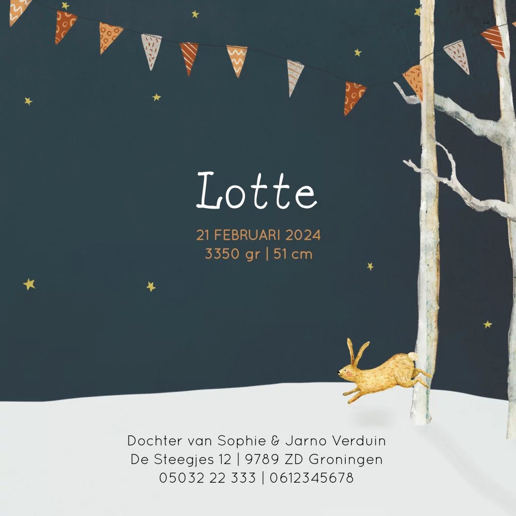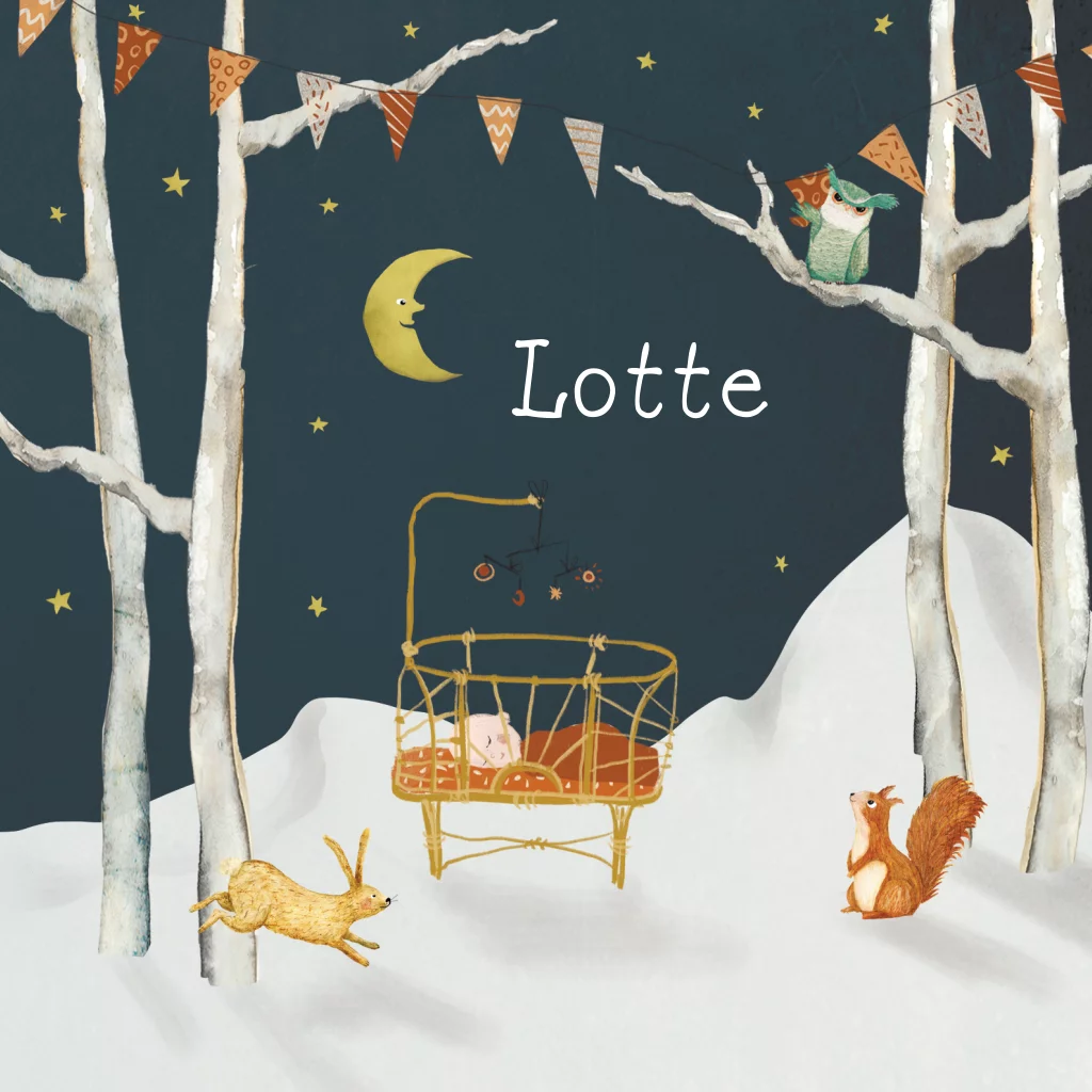 In dit winterse geboortekaartje Lotte kijken de bosdieren nieuwsgierig naar het baby'tje in het rotan wiegje midden in het bos in de sneeuw.
