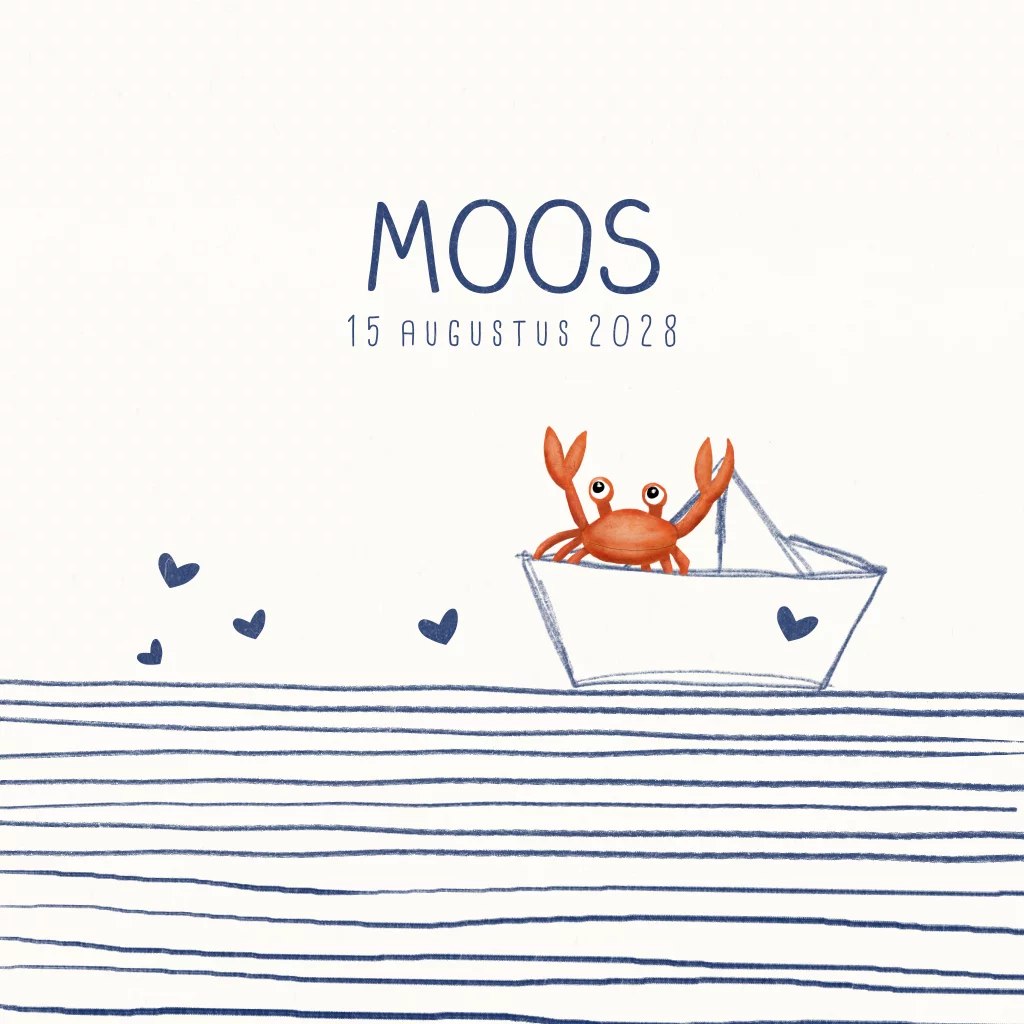 Eenvoudig getekend geboortekaartje Moos, met een krab, streepjes in marineblauw en een papieren bootje.