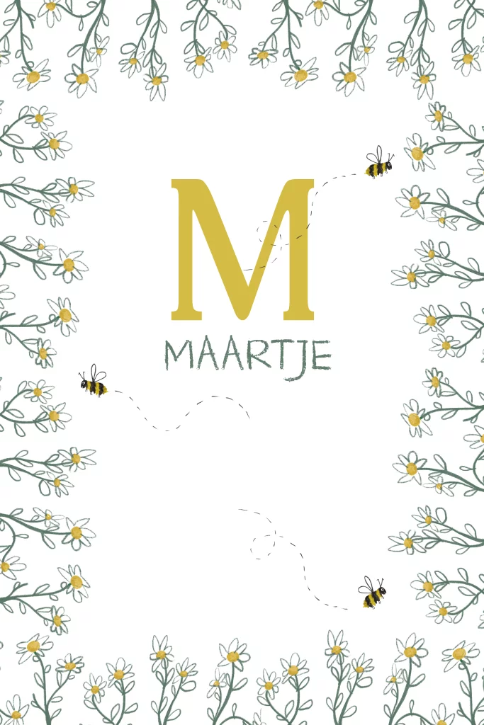 Zomers geboortekaartje Maartje van de bloemetjes en bijtjes. Je kunt de achtergrond zelf aanpassen voor een heel andere stijl.