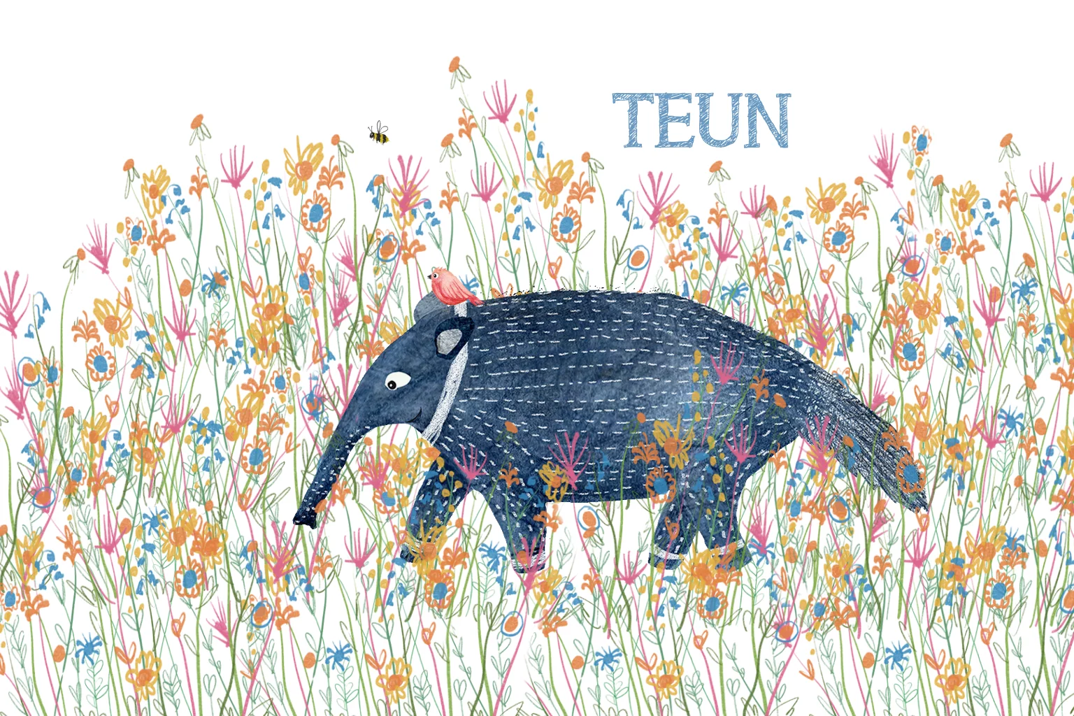 Grappige miereneter in een bloemenweide op het geboortekaartje Teun. Leuk met ronde hoeken. Echt een zomers kaartje!