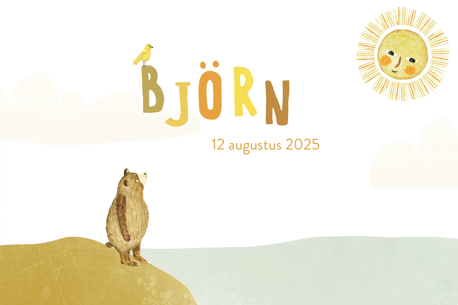 Zonnig geboortekaartje Bjorn met een strand, zonnetje en de beer die kijkt naar de speelse gekleurde letters. De letters zijn afzonderlijk geplaatst, zodat je ze eenvoudig kunt veranderen.