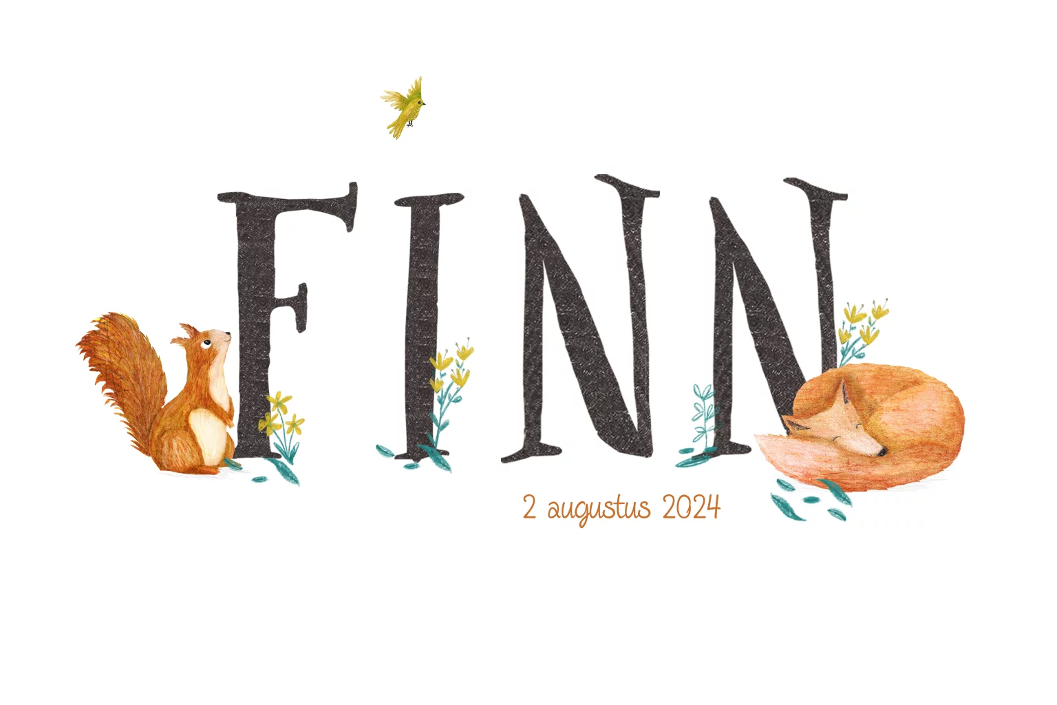 Schattig en opvallend dierenalfabet geboortekaartje Finn met gele bloemetjes en lieve oranje bosdieren, zoals de slapende vos en het nieuwsgierige eekhoorntje.
