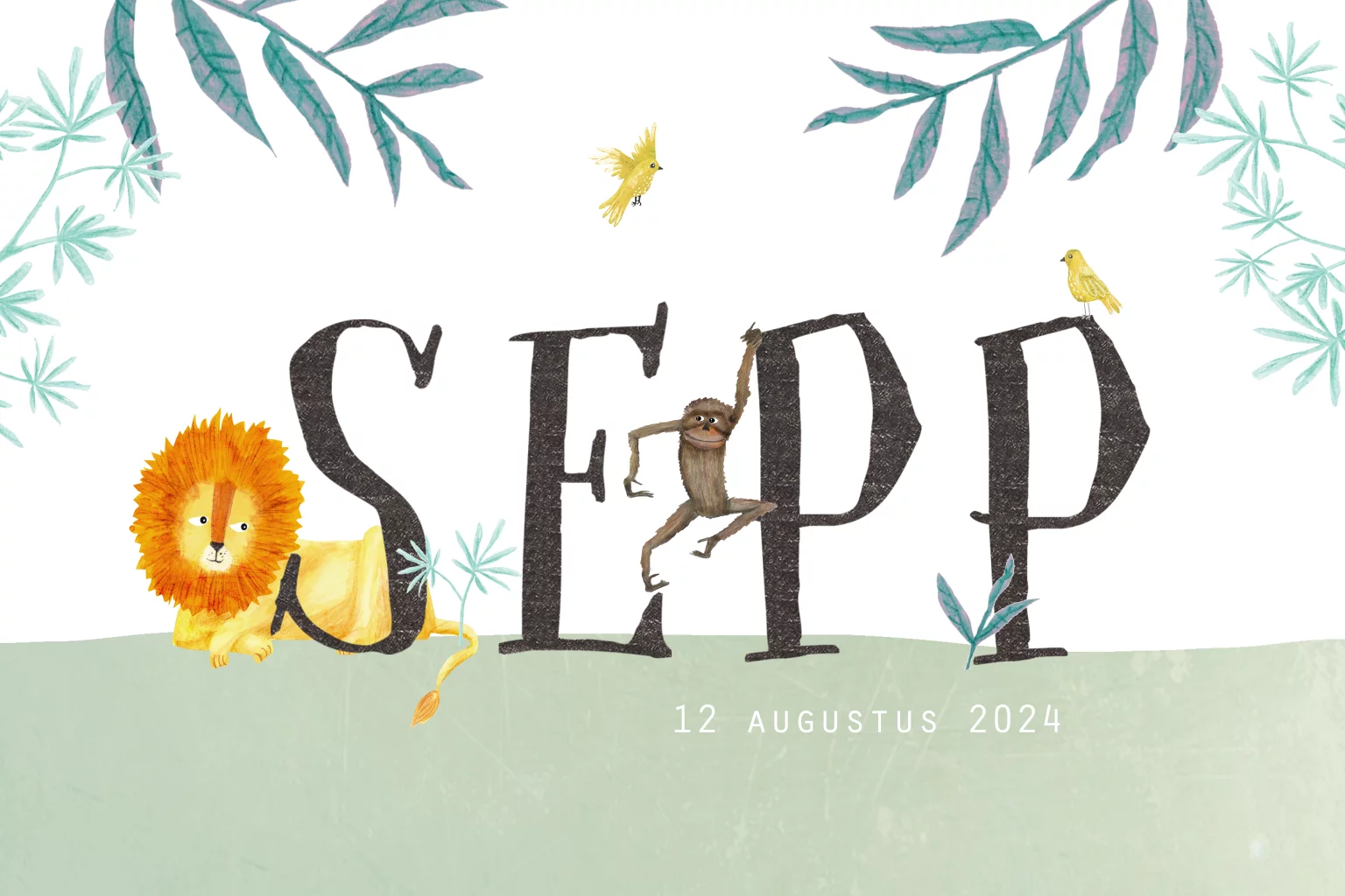 Stoer geboortekaartje Sepp in jungle stijl met grote letters een hangend aapje en een lieve leeuw.