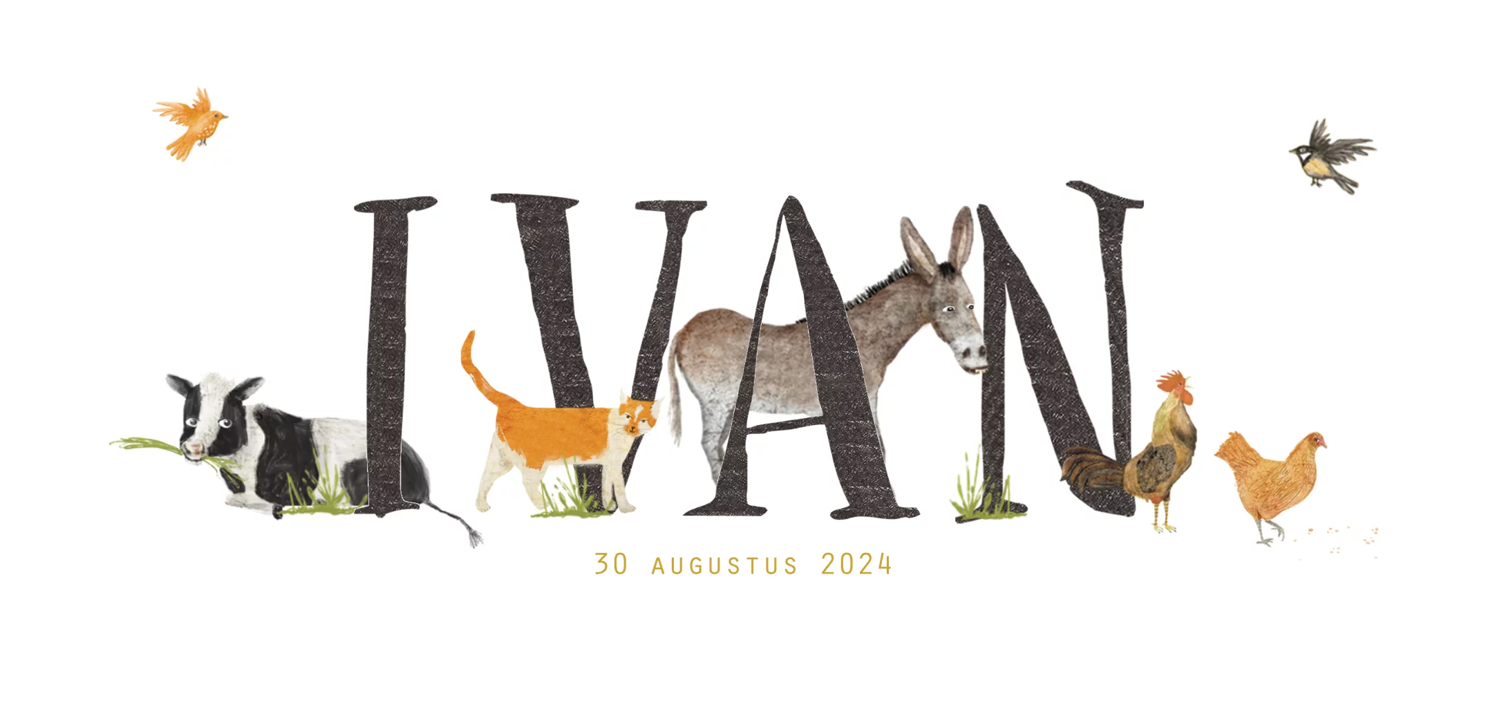 Grappig geboortekaartje Ivan met dierenalfabet letters en boerderij dieren als een ezel, kippen, een haan, een poes en een kalfje. Leuk als je op de boerderij woont!