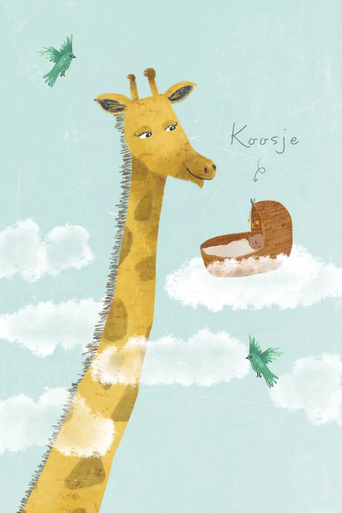 Schattig geboortekaartje Koosje met een giraf met zijn hoofd in de wolken en een baby in een wiegje. Een wolk van een baby!