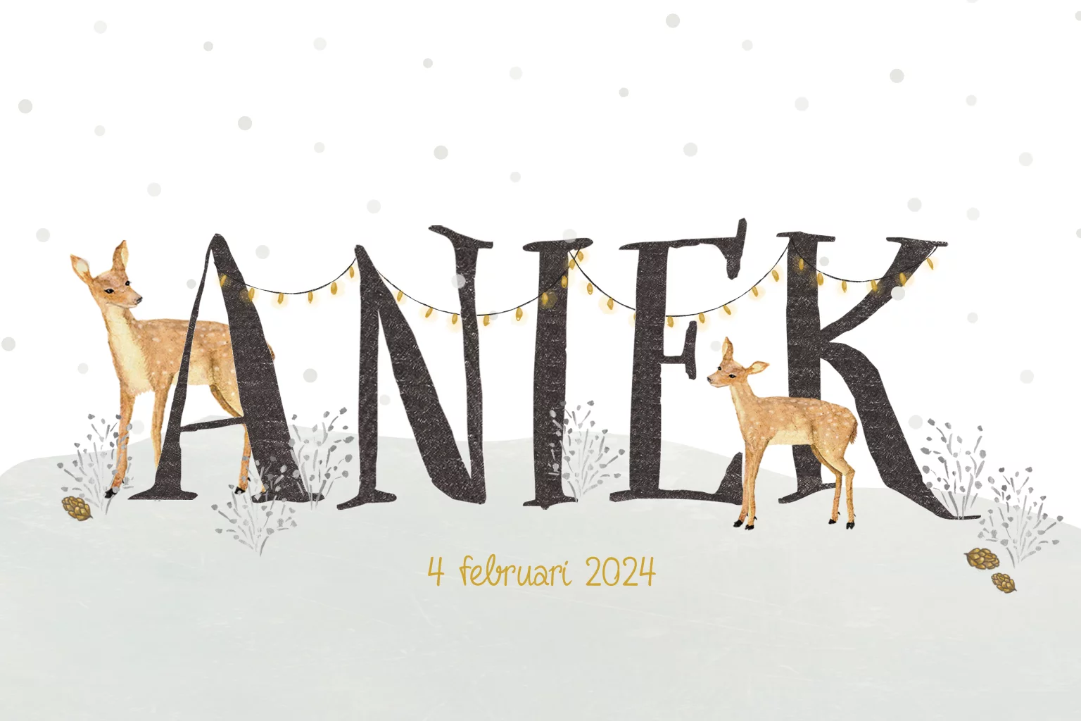 Winters geboortekaartje Aniek met grote letters uit het dierenalfabet en hertjes in de sneeuw. De naam is versierd met een lichtjesslinger. Een lief winters geboortekaartje!