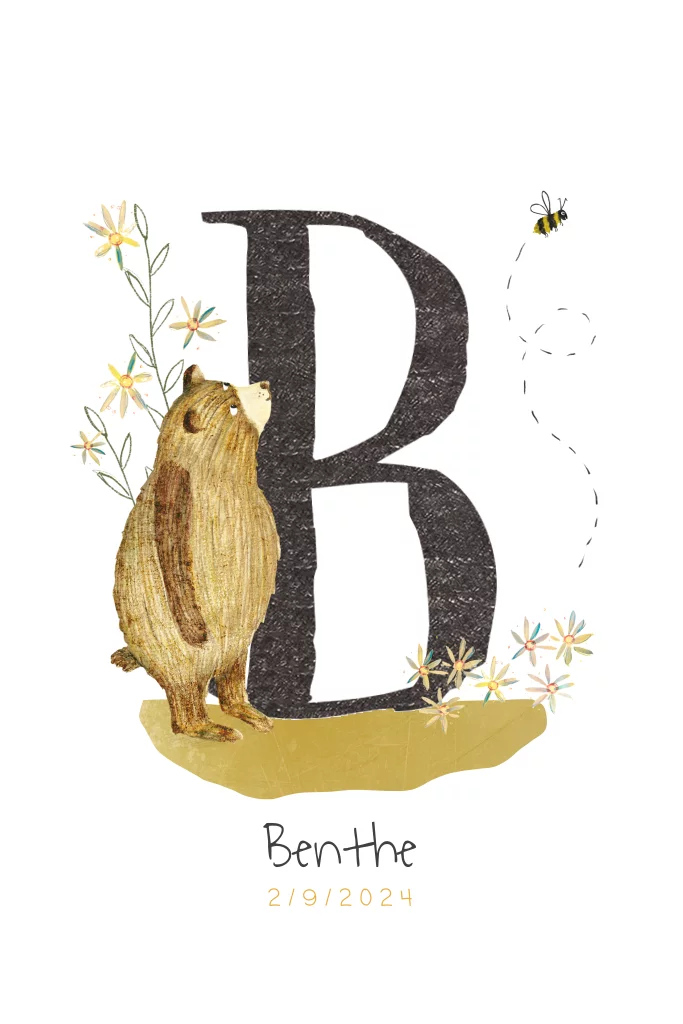 Geboortekaartje met initiaal B van beer, bij en bloem