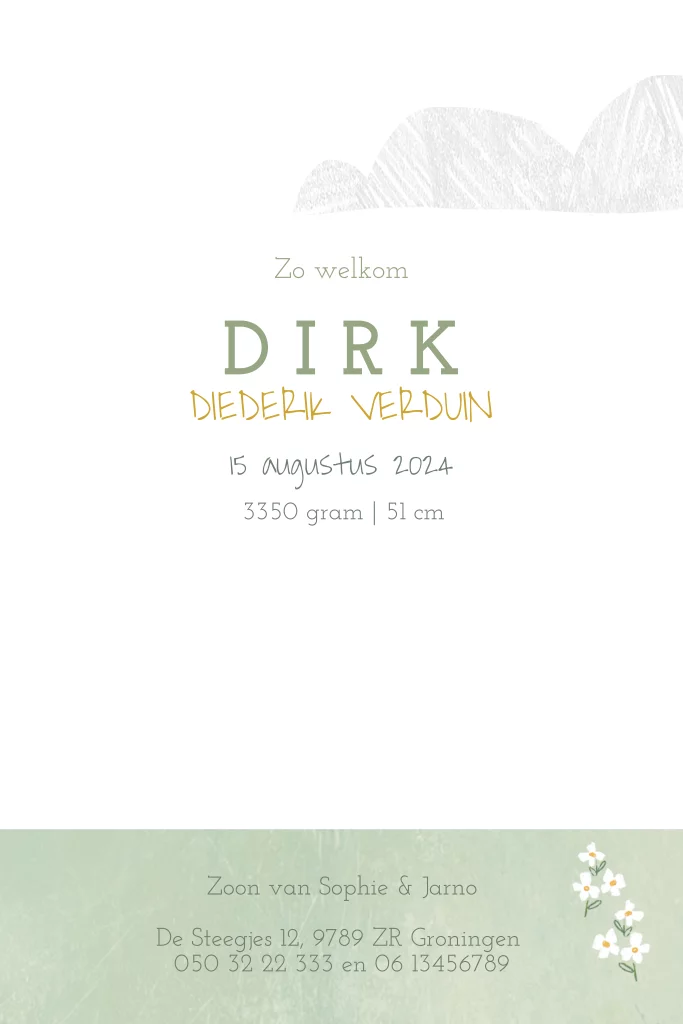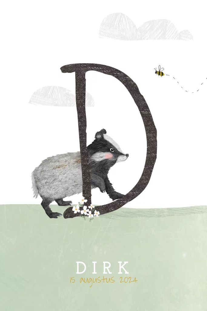 Lief geboortekaartje Dirk met de initiaal D en een tekening van een das met wolkjes, een bijtje en wat bloemetjes.