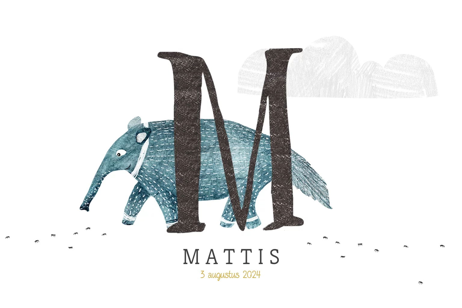 Grappige miereneter uit het dierenalfabet op het geboortekaartje Mattis met de initiaal M.