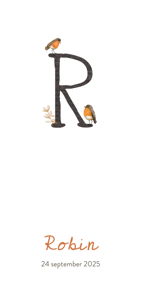 Natuurlijk geboortekaartje Robin met lieve roodborstjes in een hippe roestbruine kleur. Mooi clean en minimalistisch kaartje met strakke letter. Leuk voor jongens en meisjes!