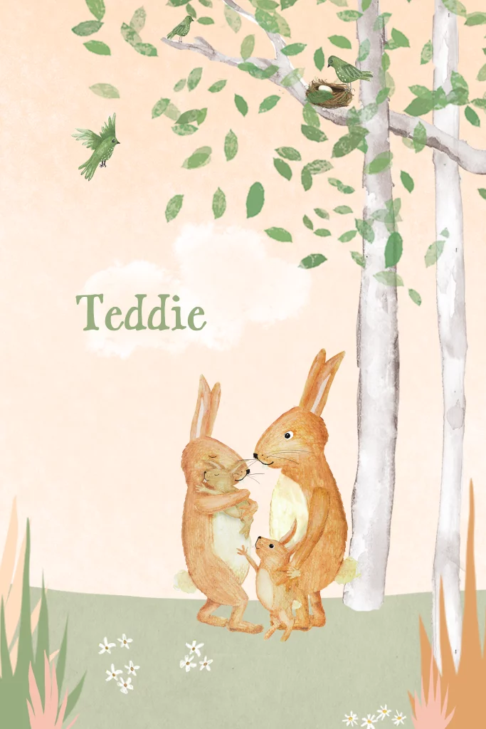 Lente geboortekaartje Teddie met getekende konijnen familie in een bos met roze lucht en lentebloemetjes. Je past dit kaartje zelf gemakkelijk aan!