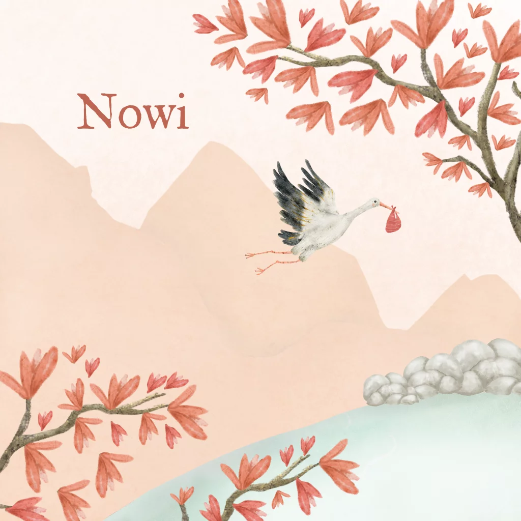 Uniek geboortekaartje Nowi met een ooievaar boven een sereen berglandschap, omringd door bloeiende takken in warme tinten. De zachte aquarelstijl en subtiele details geven een verfijnde, Japanse uitstraling. Perfect voor een tijdloos en dromerig geboortekaartje
