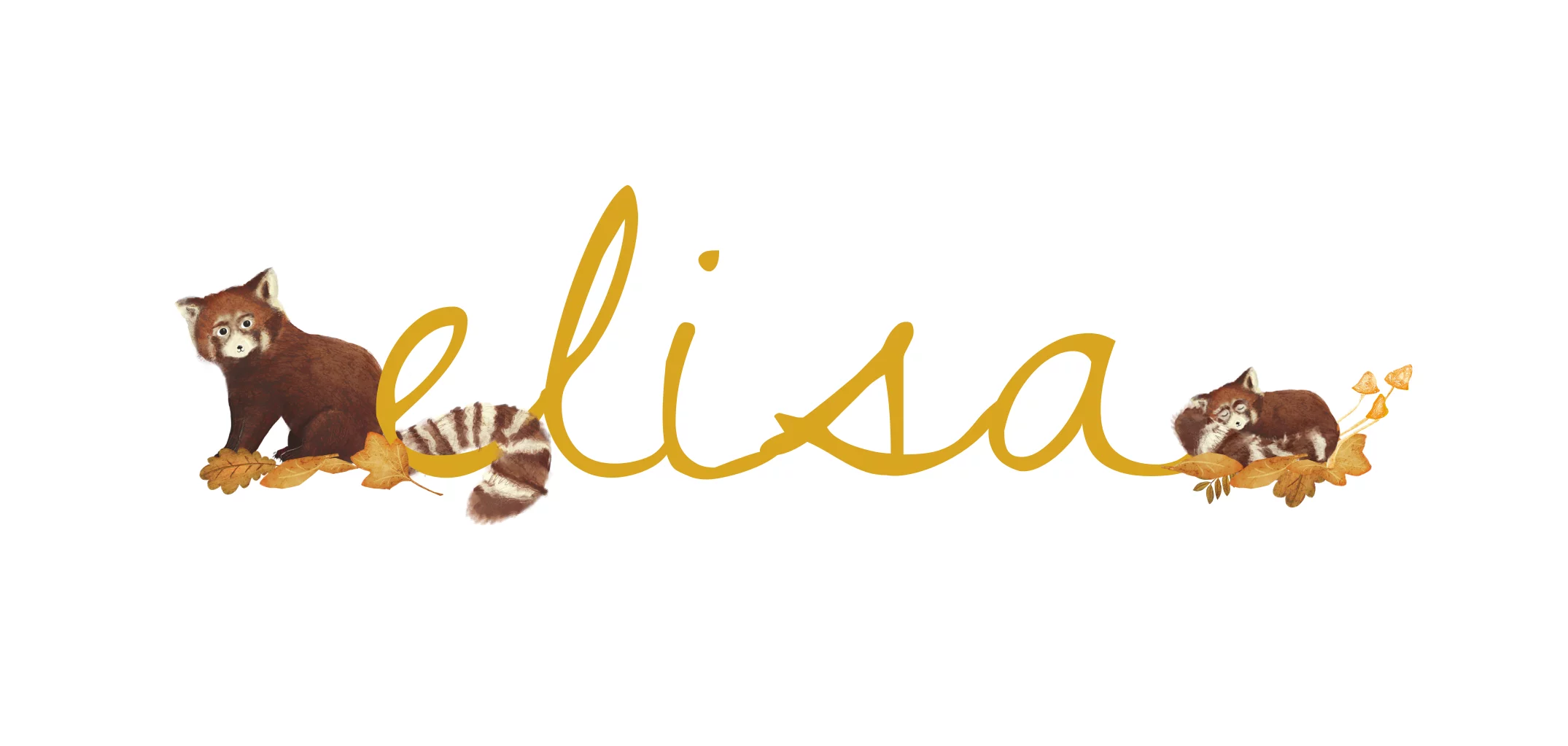 Lief geboortekaartje Elisa met een rode panda baby en ouder en mooie gele en roodbruine herfstblaadjes. Vervang de blaadjes en de kleuren en maak er een heel eigen kaartje van.
