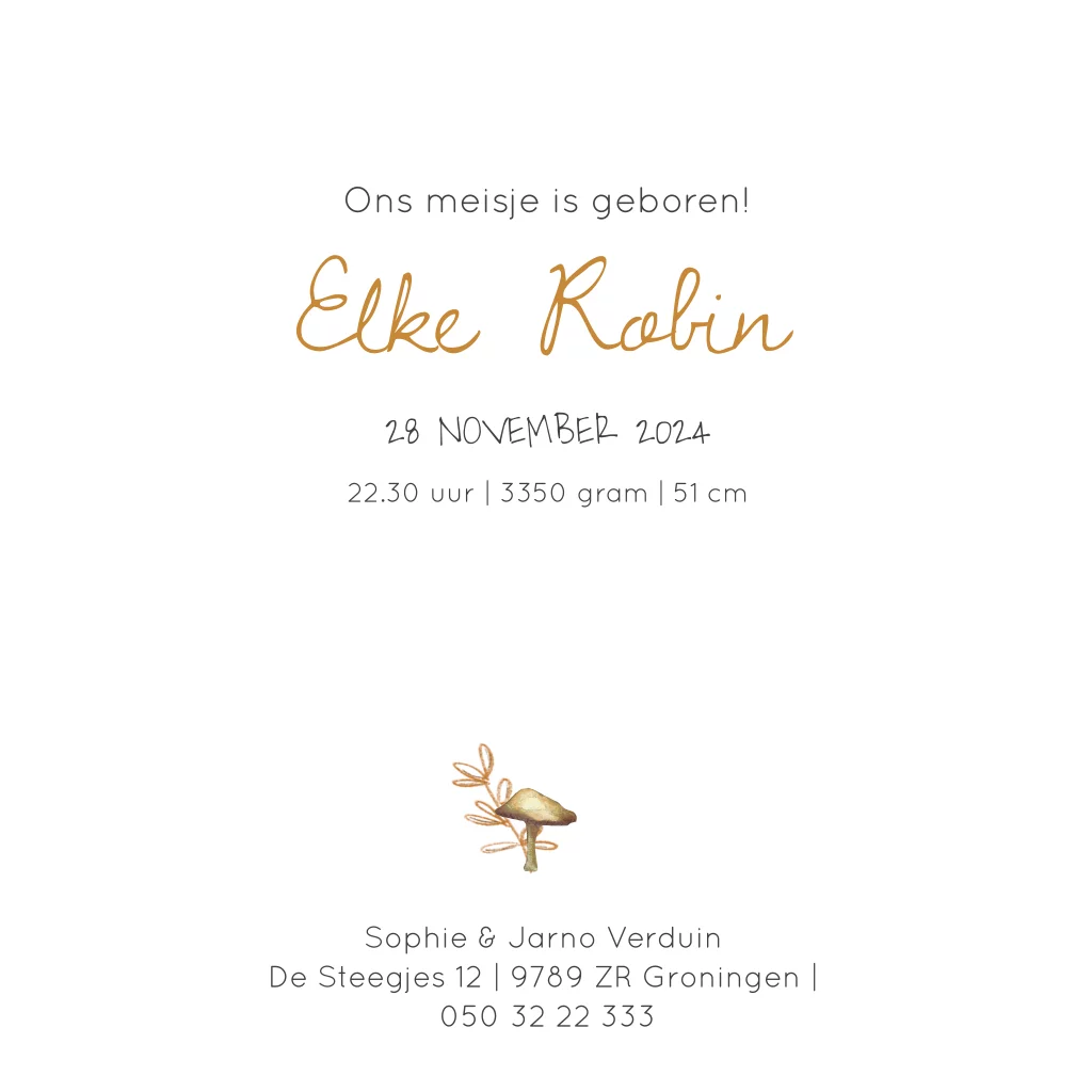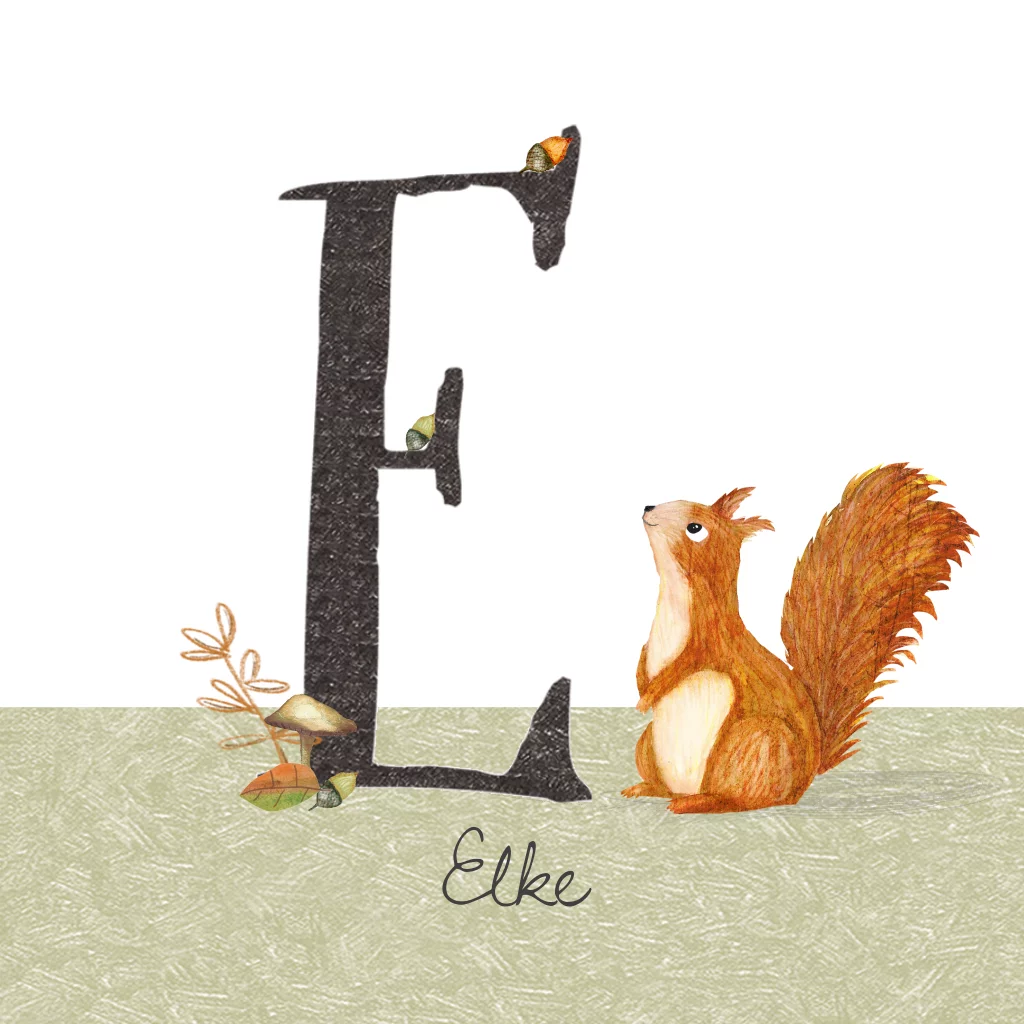 Geboortekaartje voor de herfst met de E van eikel en eekhoorn uit het dierenalfabet. Lekker herfstig met de paddestoel en de blaadjes.