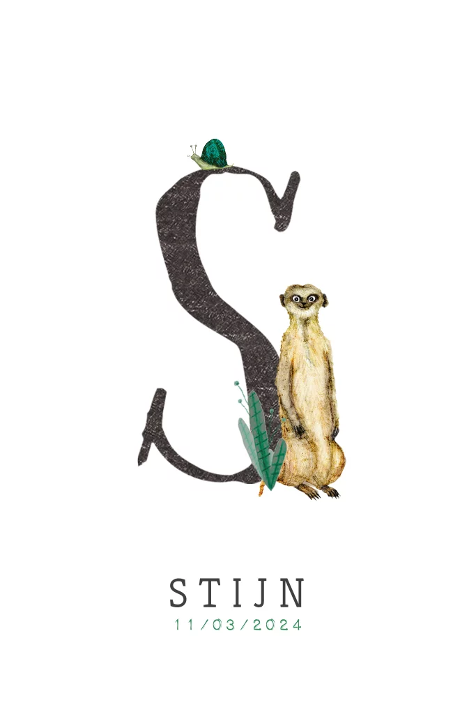 In dit schattige geboortekaartje Stijn met het grappig stokstaartje uit mijn dierenalfabet staat de initiaal uit van jullie kindje centraal.