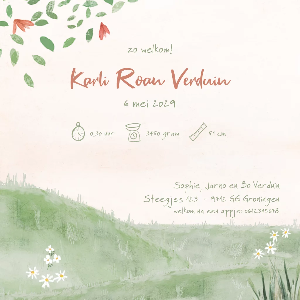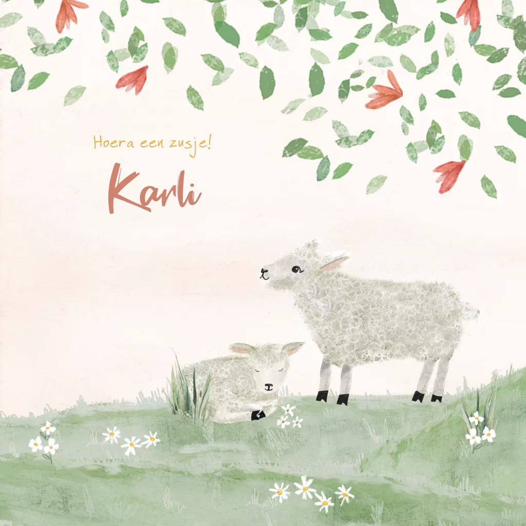 Lief lente geboortekaartje met twee schattige lammetjes in een bloemrijke wei onder een bloeiende magnoliaboom. De handgetekende illustratie geeft het kaartje een zachte en natuurlijke uitstraling. Perfect voor een voorjaarsbaby en eenvoudig te personaliseren.
