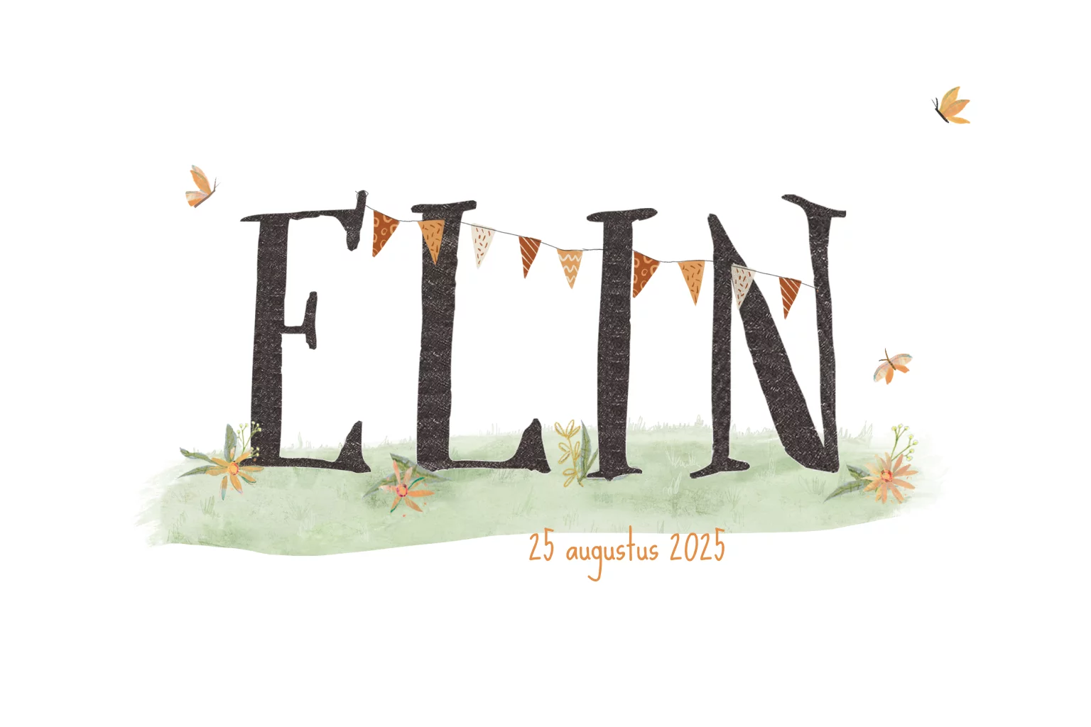 Zomers geboortekaartje Elin, met bloemetjes , slingertje en vlinders in hippe roest kleuren.
