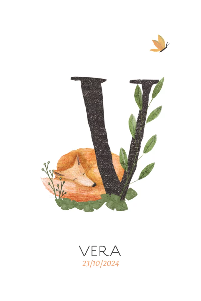 In dit schattige geboortekaartje staat de initiaal V van jullie kindje centraal, versierd met het slapende vosje uit mijn dierenalfabet.