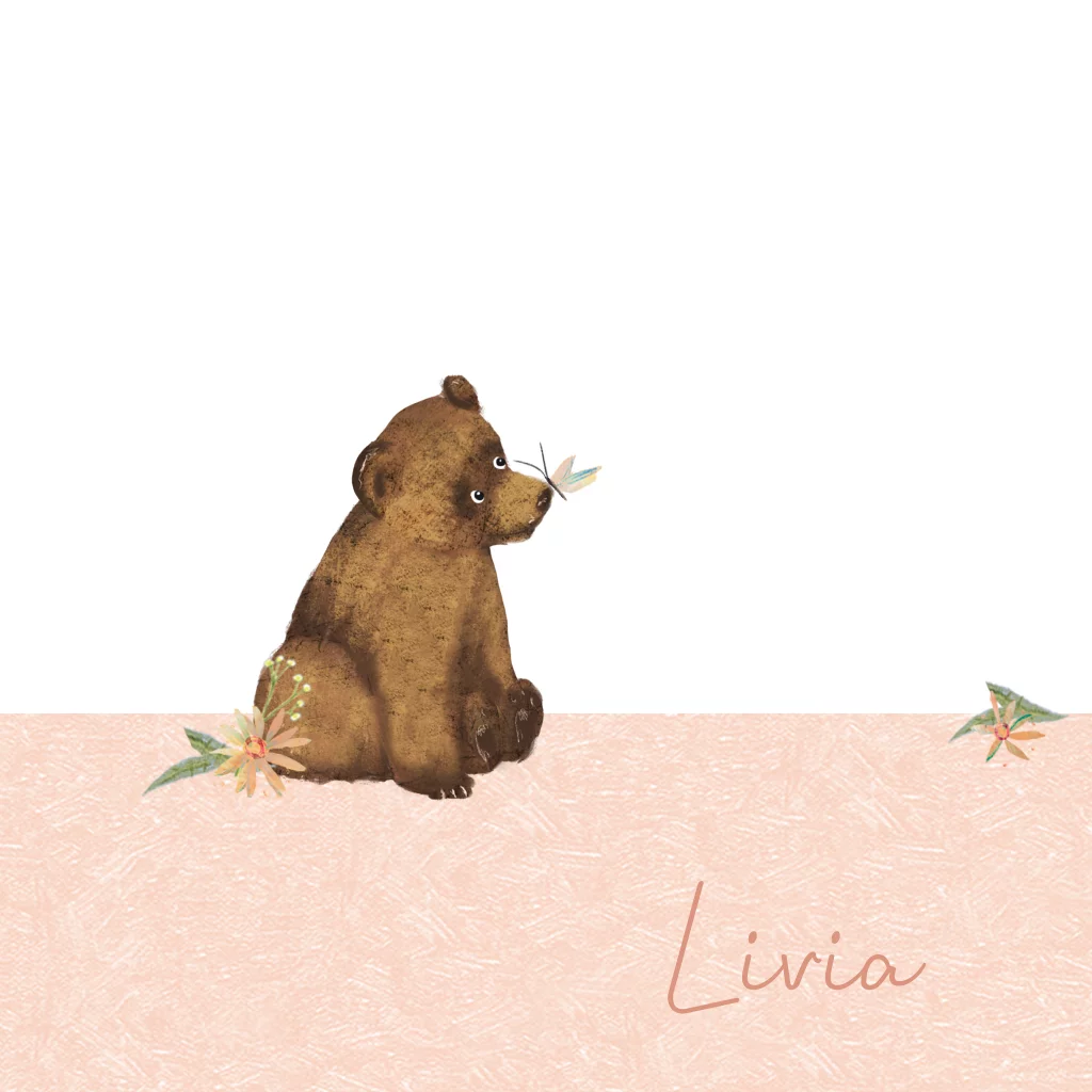 Lief geboortekaartje Livia met beertje met vlinder op zijn neus op een zacht roze ondergrond met bloemetjes. Lief kaartje voor je dochter!