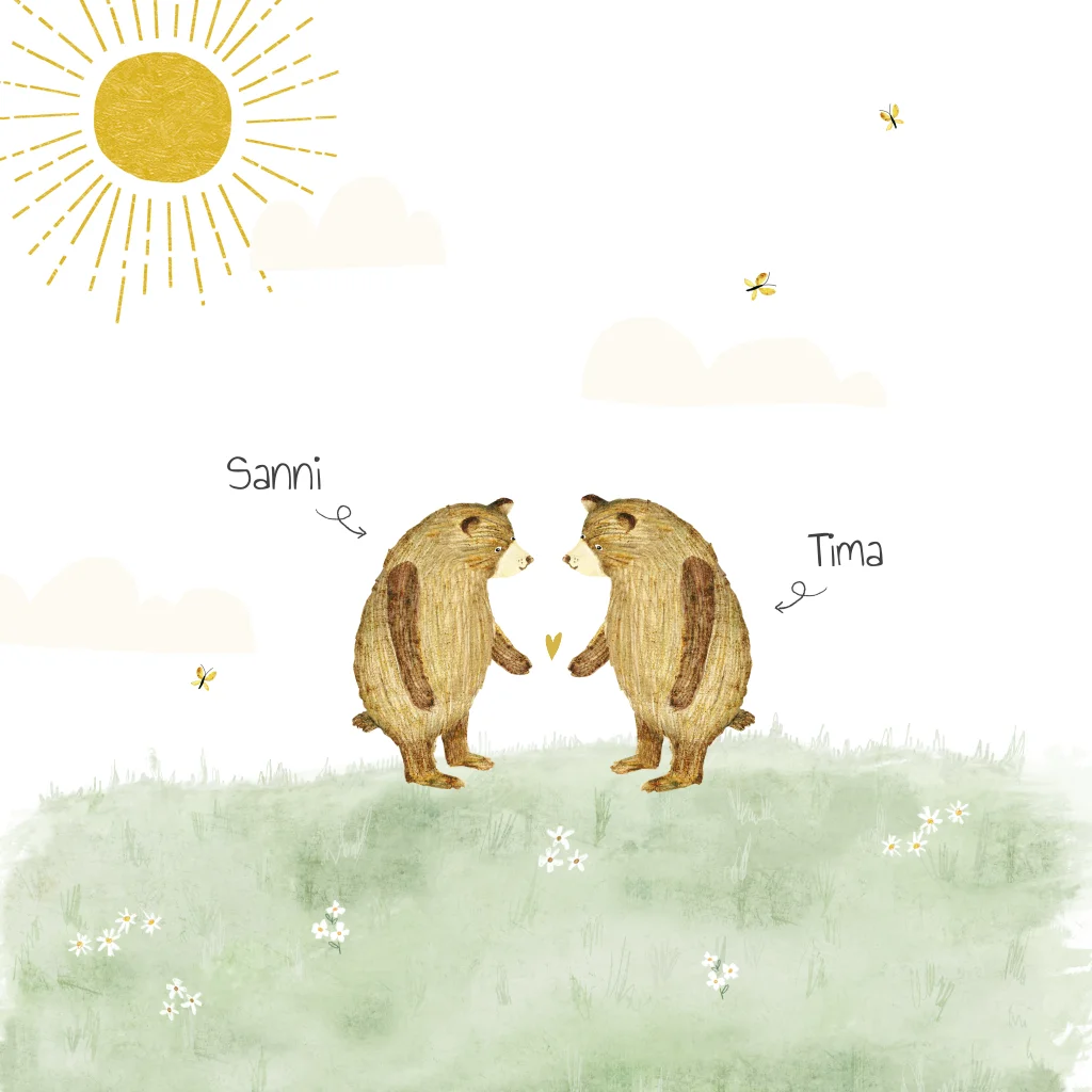 Zonnig geboortekaartje voor een tweeling Sanni en Tima, met twee beren in een veld met bloemen en vlindertjes, hartje en een mooie zon.
