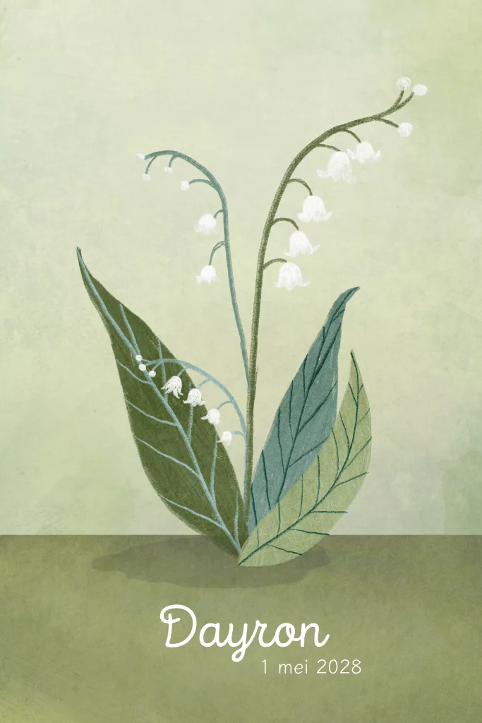 Geboortekaartje Dayron met een illustratie van de geboortebloem van de maand mei, het lelietje der dalen.