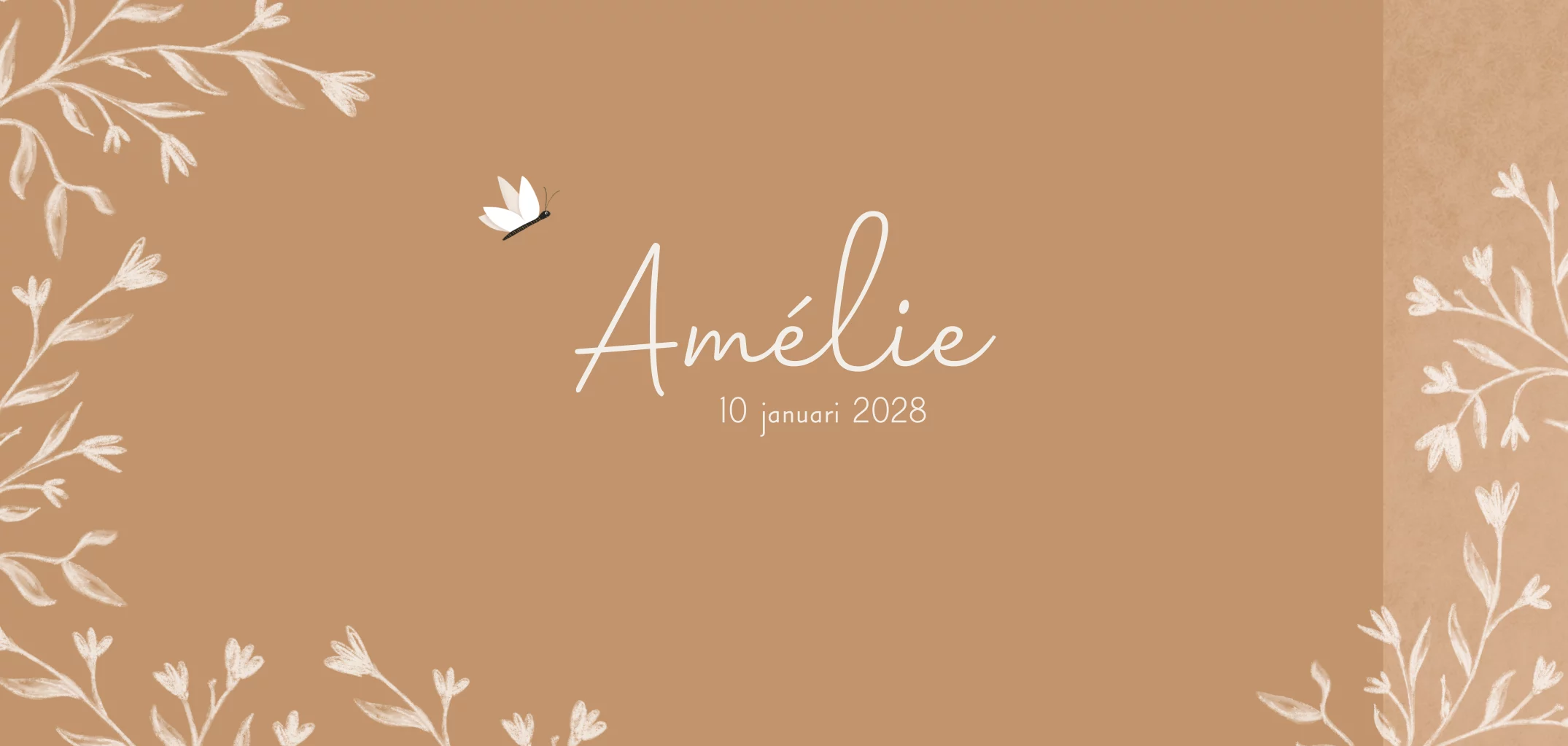 Eenvoudig geboortekaartje Amelie, met witte getekende bloemen op een terracotta kleur met een wit vlindertje. je kunt dit kaartje zelf aanpassen.
