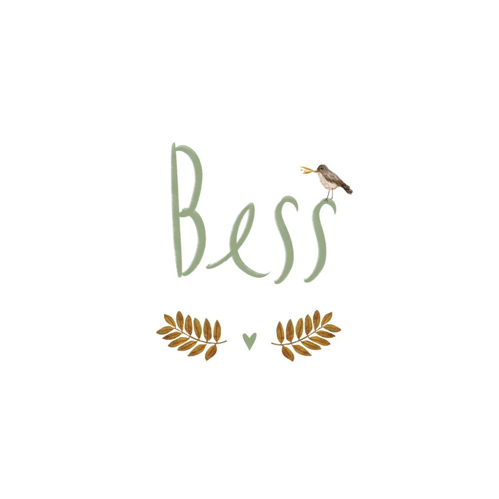 Eenvoudig herfst geboortekaartje Bess met handgeschreven letters, herfstbladeren met een kaartje en een vogeltje. Mooi met ronde hoeken!