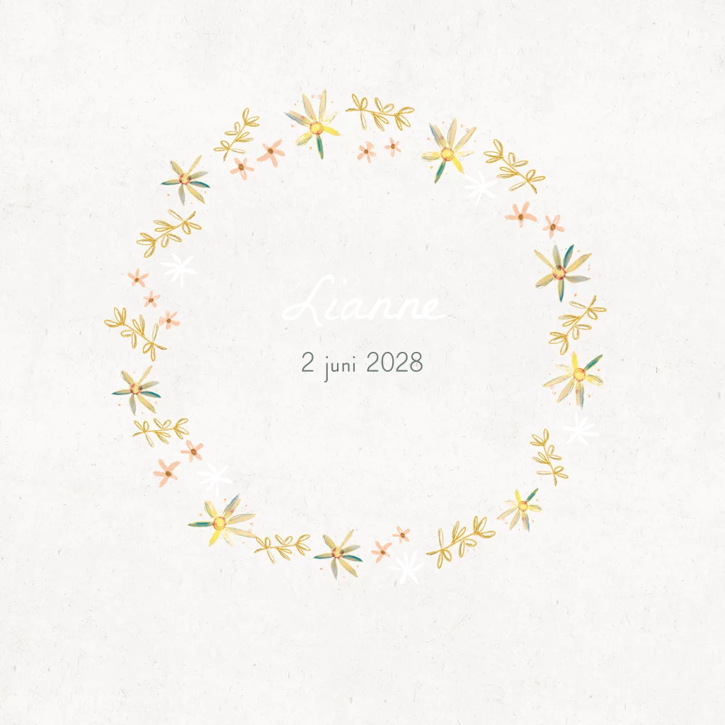 Fijn en lief geboortekaartje Lianne met een krans van kleine roze en gele bloemetjes met wat folie details. Je kunt dit kaartje zelf naar wens aanpassen met andere bloemetjes, takjes of dieren uit de beeldbank.