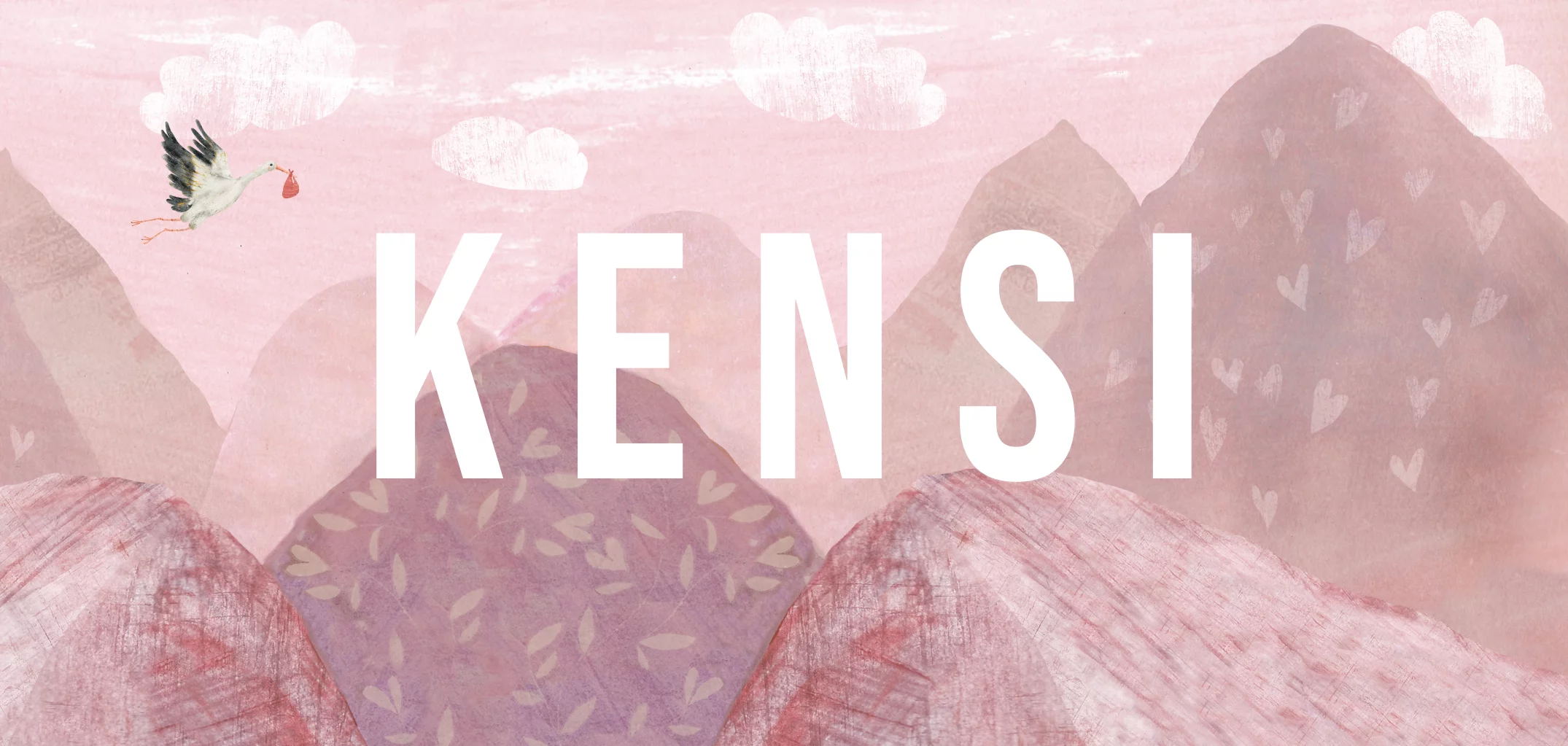 Geboortekaartje roze berglandschap Kensi met ooievaar en baby en grote strakke letters. Je past dit kaartje eenvoudig zelf aan!