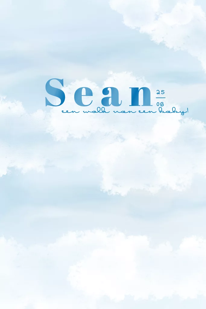 Geboortekaartje Sean in de wolken, met blauwe spotlak (hoogglans). Je kunt dit kaartje zelf aanpassen!