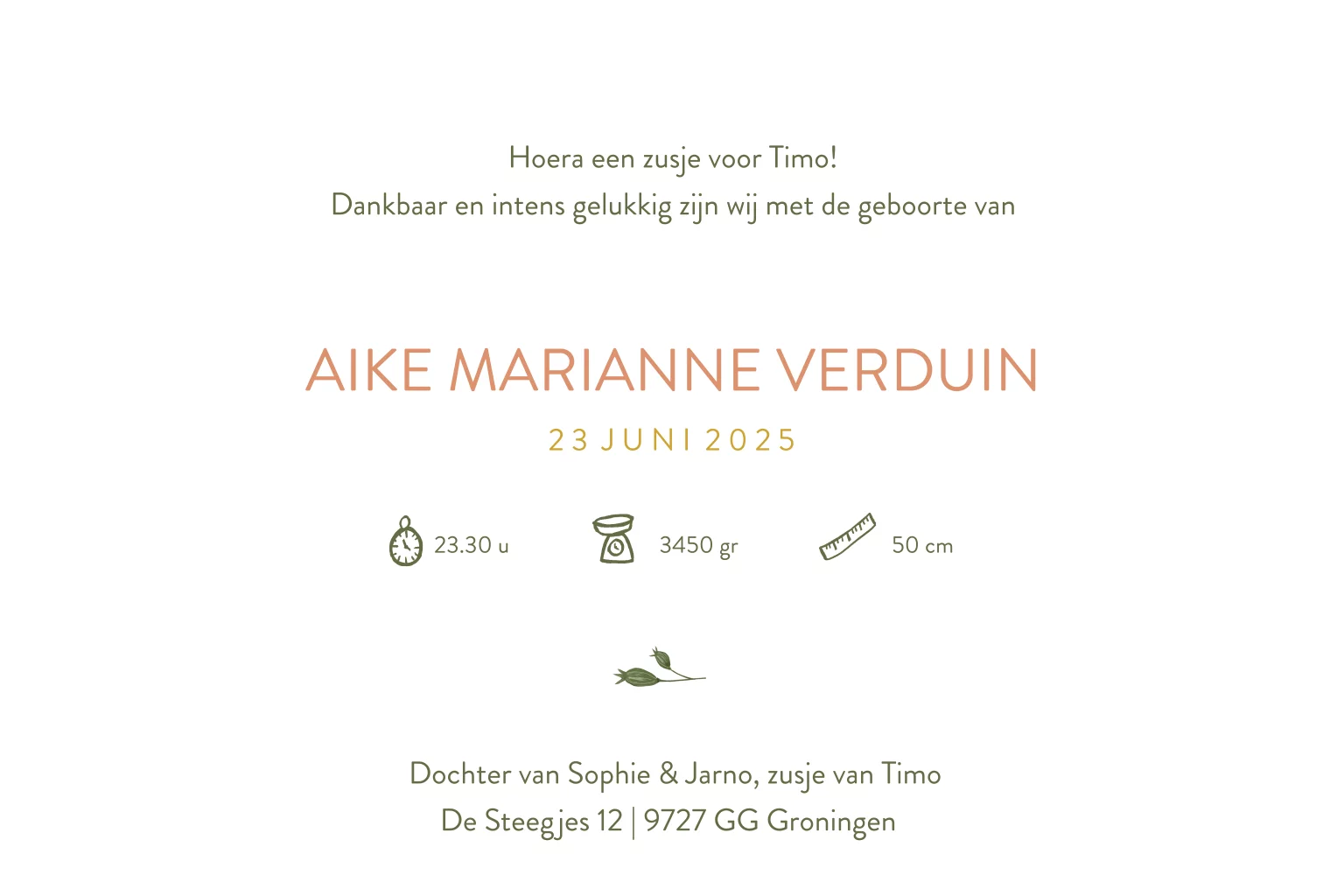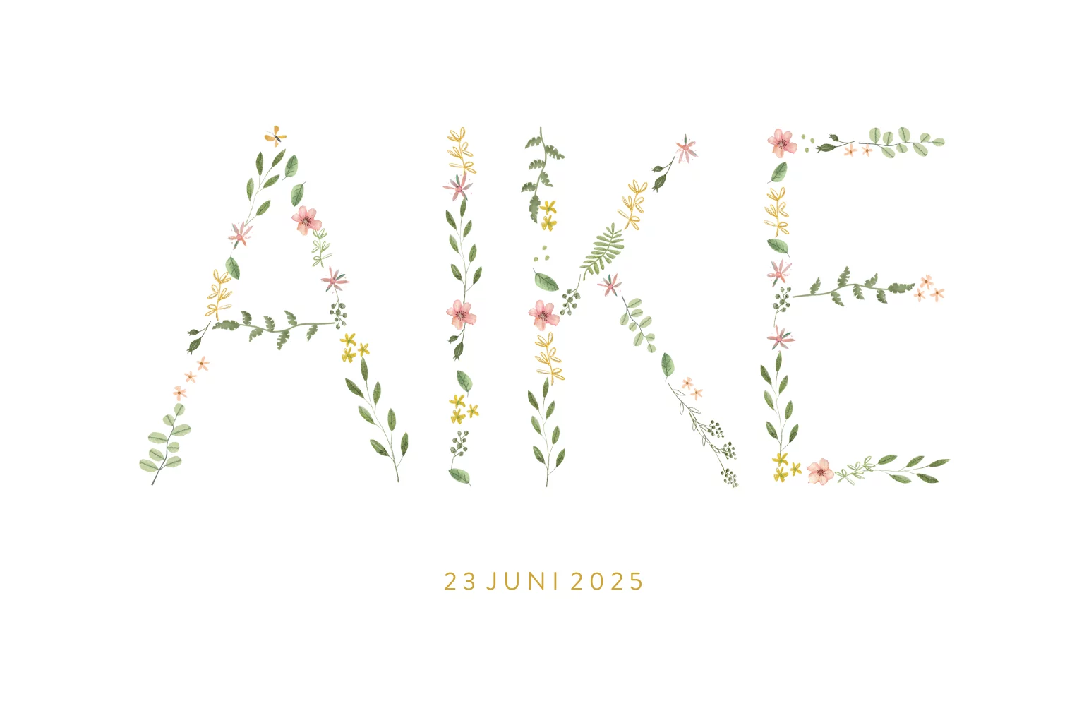 Hip en eenvoudig geboortekaartje Aike met zomerse bloemenletters. Kies de letters uit de beeldbank en maak er je eigen ontwerp van. Kom je er niet uit? Ik help je graag!