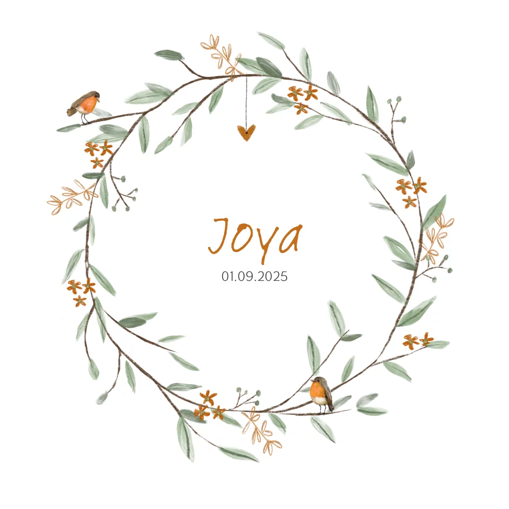 Romantisch geboortekaartje Joya met bladerkrans met roestbruine bloemetjes, mooi groen blad en twee roodborstjes. Subtiel en romantisch kaartje. Ook mooi om wat details in foliedruk te doen.