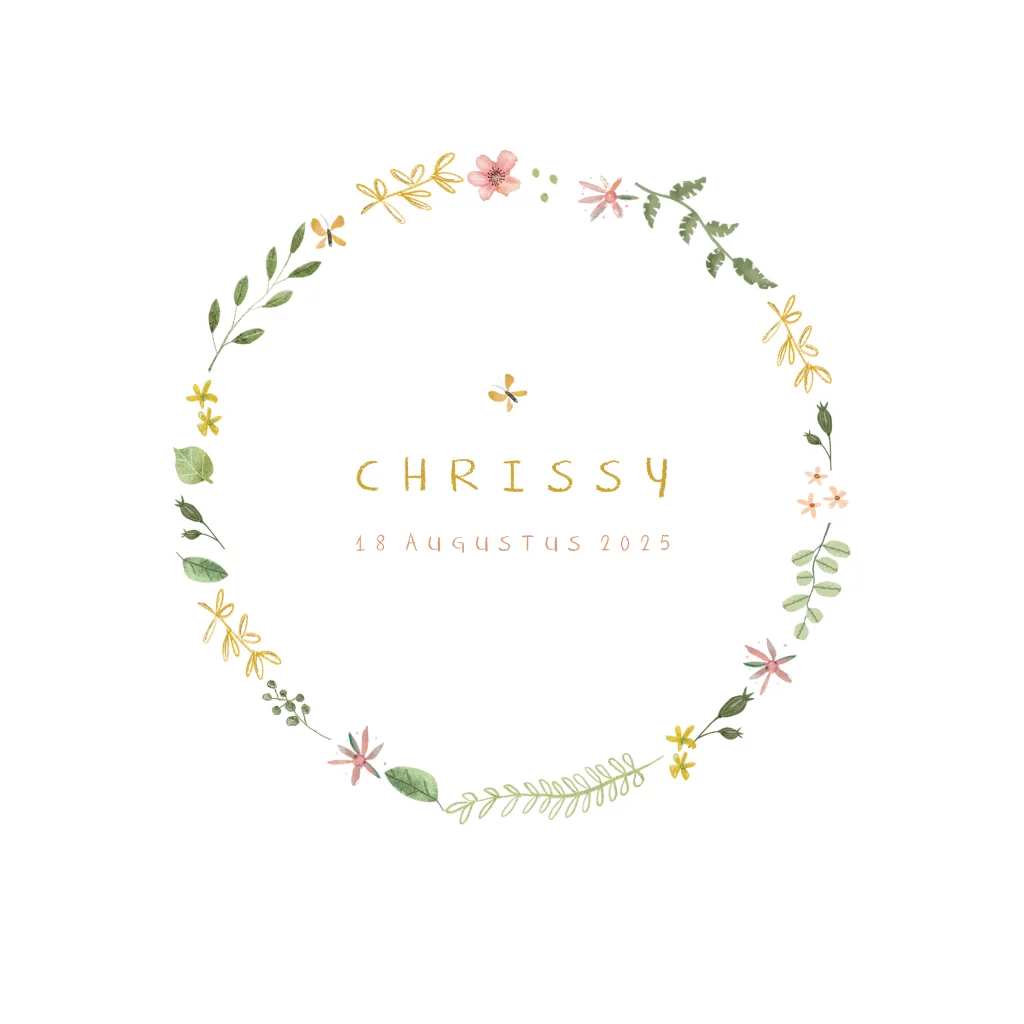 Schattig en zomers geboortekaartje Chrissy met bloemenkrans en ronde hoeken. Leuk om als een klein 11 x 11 cm kaartje af te laten drukken op Oud-Hollands papier.