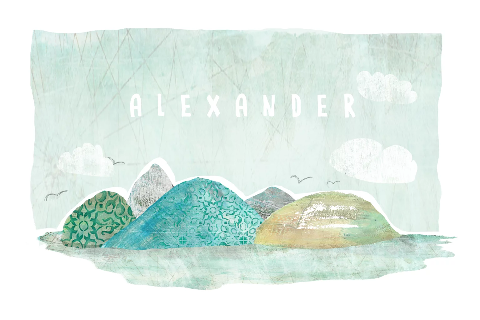 Zomerse geboortekaartje Alexander met een verweerd zomers sfeertje van eilanden in de zee. Mooie tinten groen en blauw en patroontjes