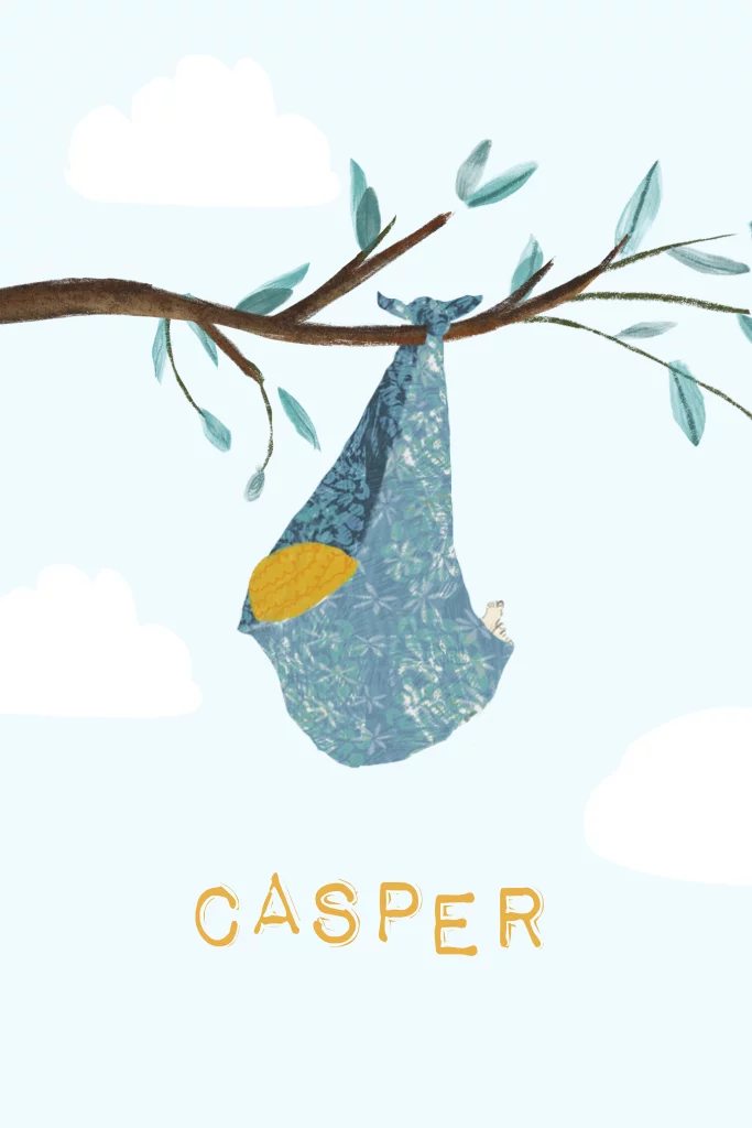 Geboortekaartje Casper met een baby in een buidel aan een tak met blauwe blaadjes. Op de achterzijde ligt de baby in een mozesmandje.