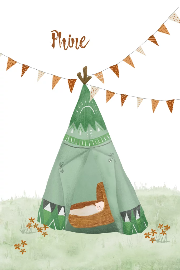 Geboortekaartje Phine met baby in een mandje in groene tipi. Feestelijke vlaggetjes en bloemetjes in roestbruin