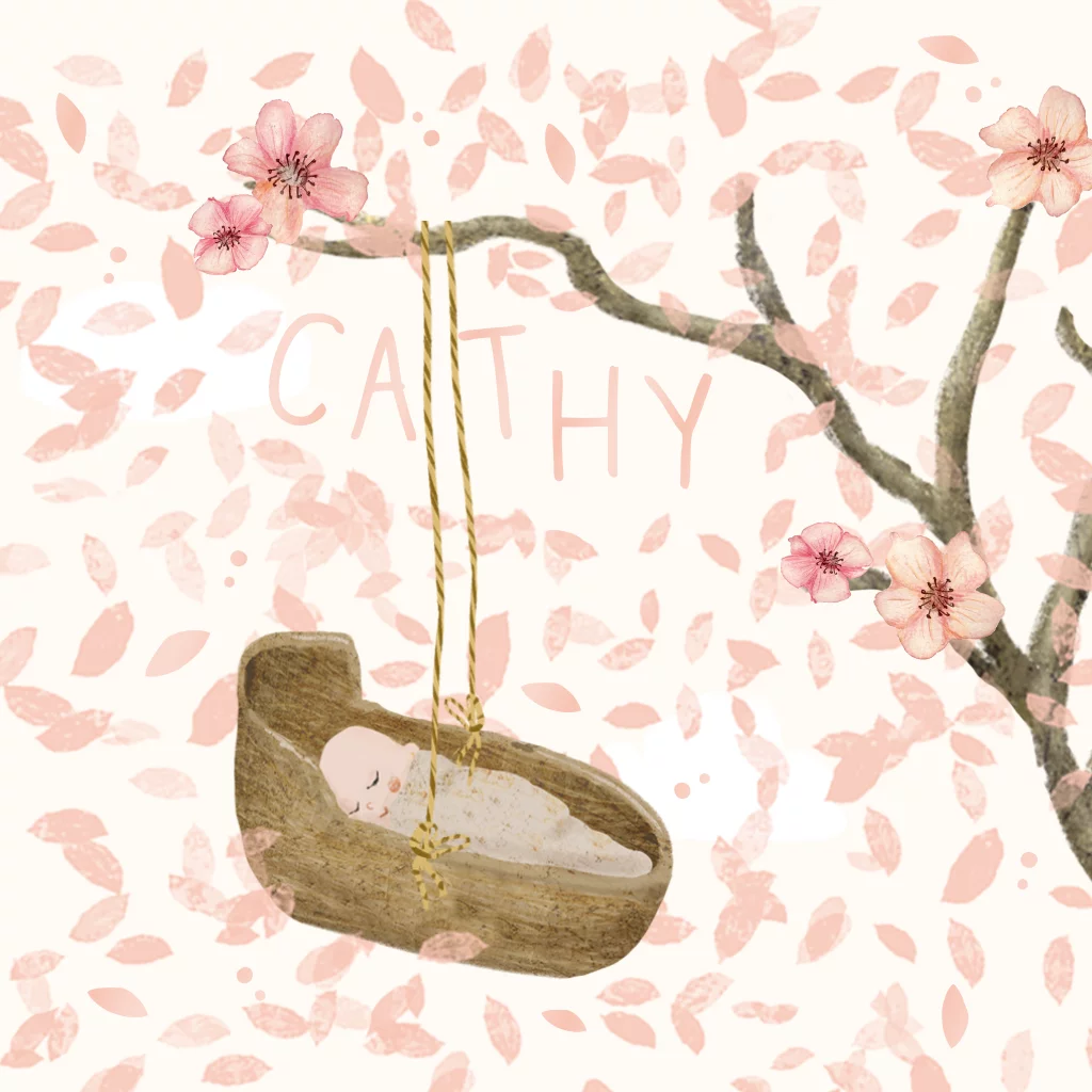 Geboortekaartje Cathy met een baby in een rieten mandje in een tak van bloesem met roze blaadjes. Hier en daar zijn er blaadjes die met hoogglans lak zijn aangezet.