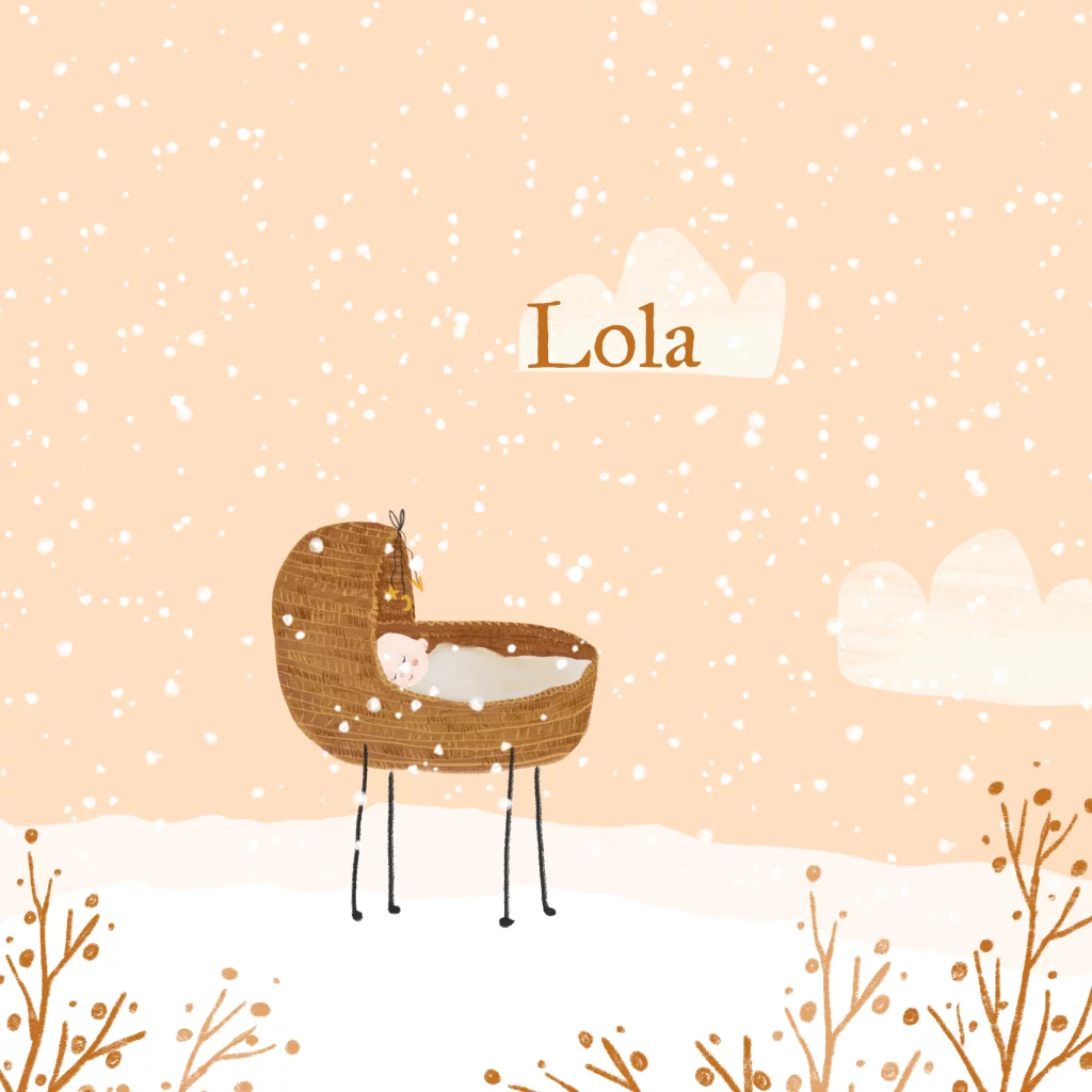 In dit lieve winterse geboortekaartje Lola staat een rotan wiegje in de sneeuw. Mooi rustig kaartje met zalmroze en roest oranje. Andere kindjes in de beeldbank!