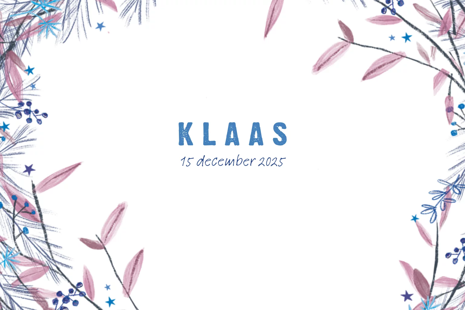 Geboortekaartje Klaas met winterse blauwe en paarse takken.