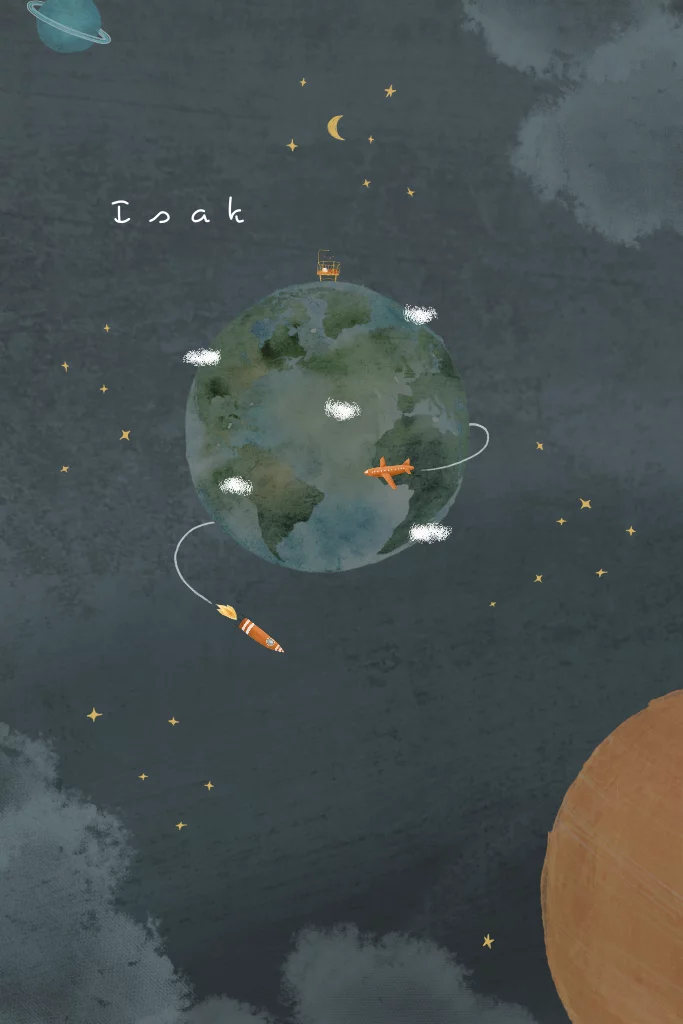 Getekend geboortekaartje Isak, met een wereldbol met een wiegje gezien vanuit de ruimte. Met de sterren, planeten, wolkjes en een raket en vliegtuig maakt die een mooi geboortekaartje voor een jongen.