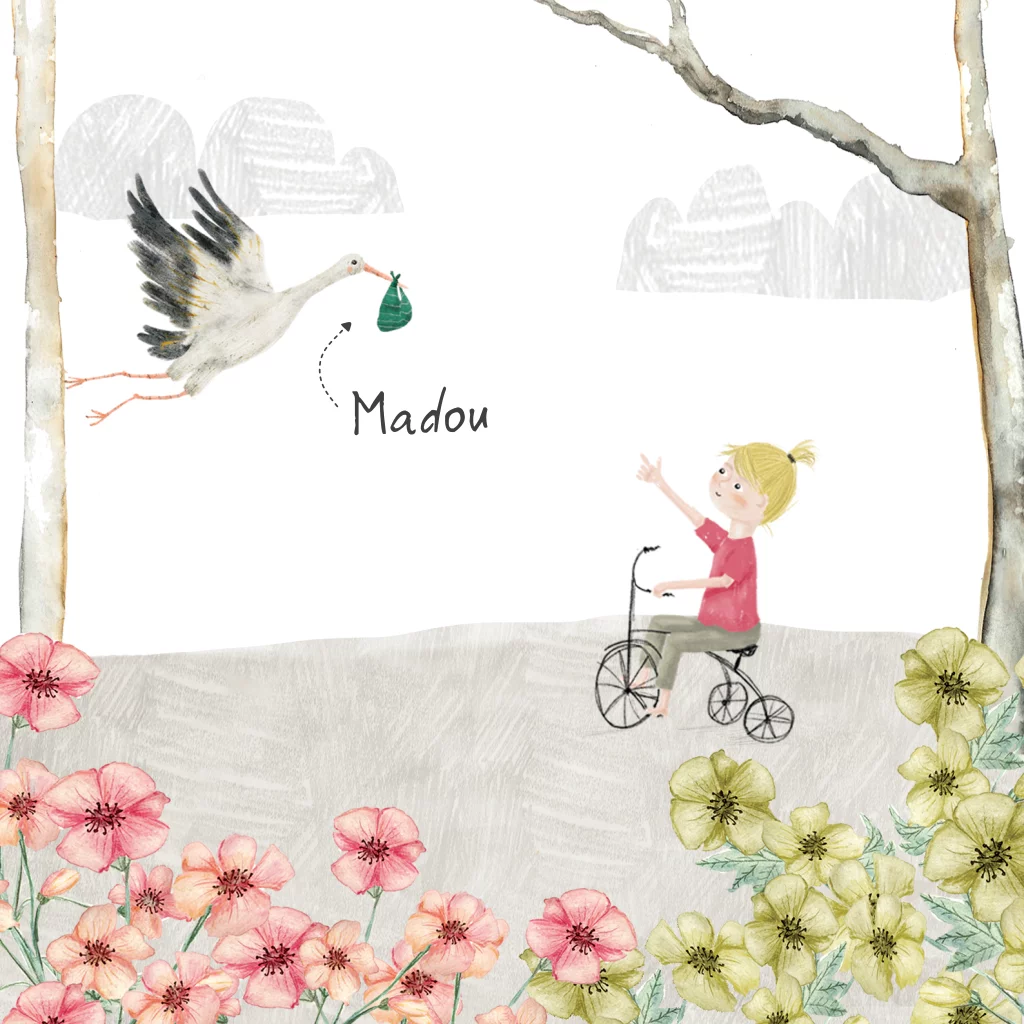 In dit schattige geboortekaartje ziet het kleine meisje op een driewieler in de tuin de ooievaar aan komen vliegen. Grappig door het pijltje bij de naam Madou naar de babybundel.