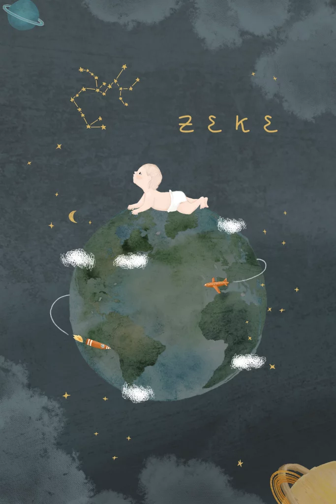 Geboortekaartje Zeke met een tekening van een wereldbol gezien vanuit de ruimte. De baby ligt op de aarde en kijkt naar zijn sterrenbeeld Boogschutter. Een bijzonder sterrenbeeld geboortekaartje.