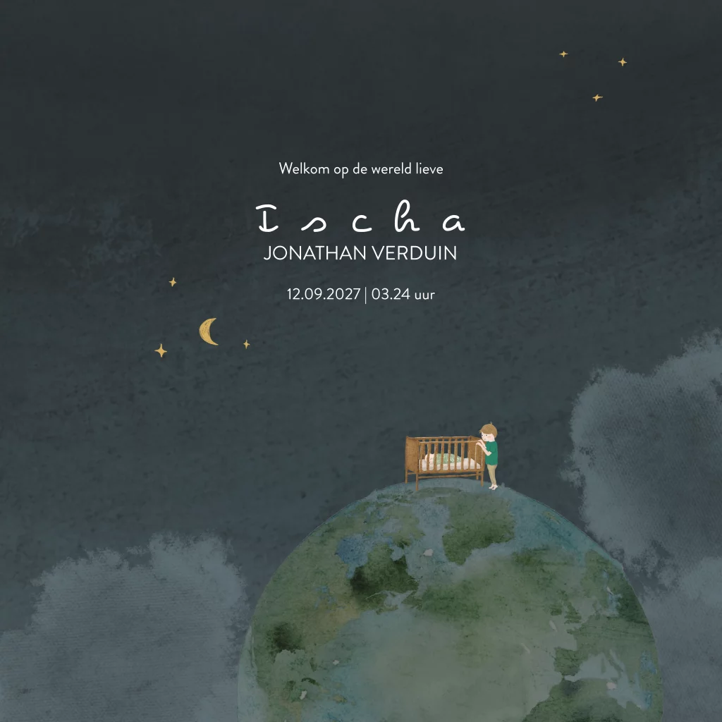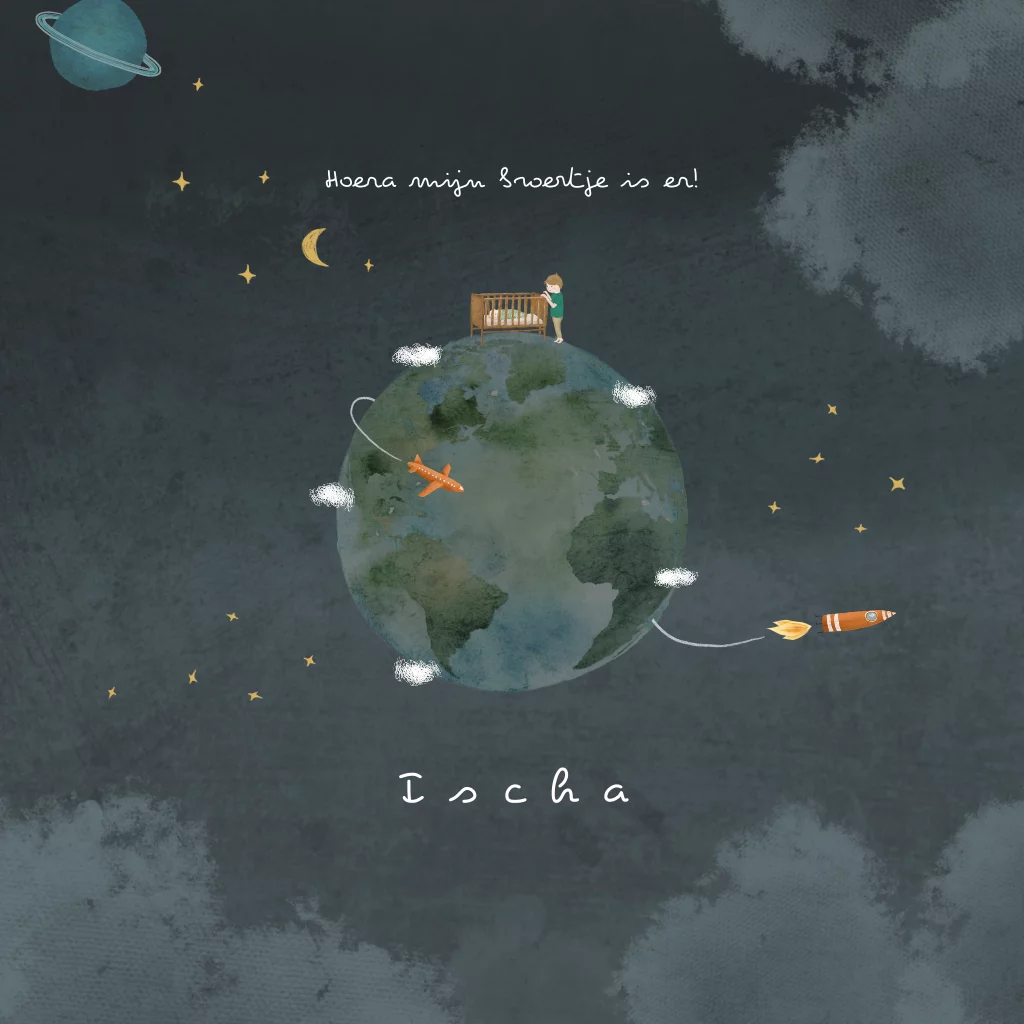 Geboortekaartje Ischa met een baby in een ledikantje op de wereldbol met zijn broertje. De wereld gezien vanuit de ruimte met planeten, een raket en ufo.