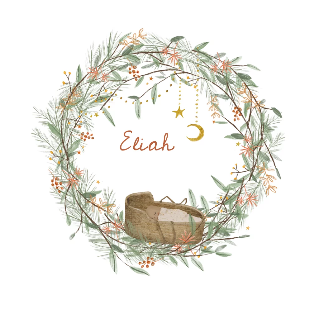 Geboortekaartje Eliah met kleurrijke winterkrans met besjes, blaadjes en takjes en een mozesmandje met een baby erin. Je kunt meer kindjes vinden in de beeldbank.