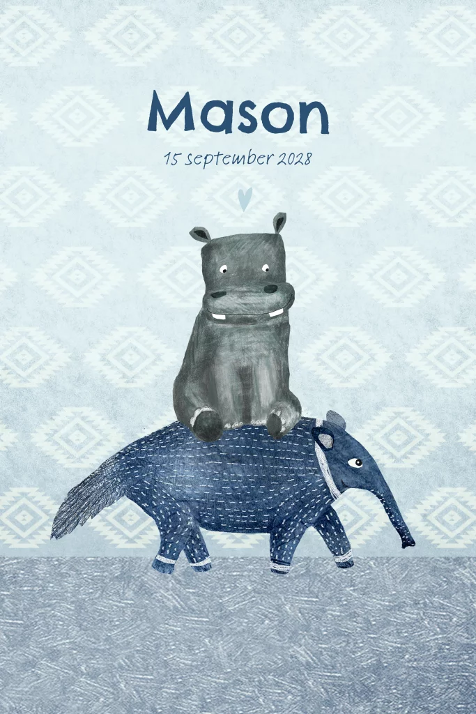 Geboortekaartje Mason met een tekening van een lieve nijlpaard die op de rug van een miereneter zit. In mooie blauwe kleuren met een vintage patroonbehangetje op de achtergrond.